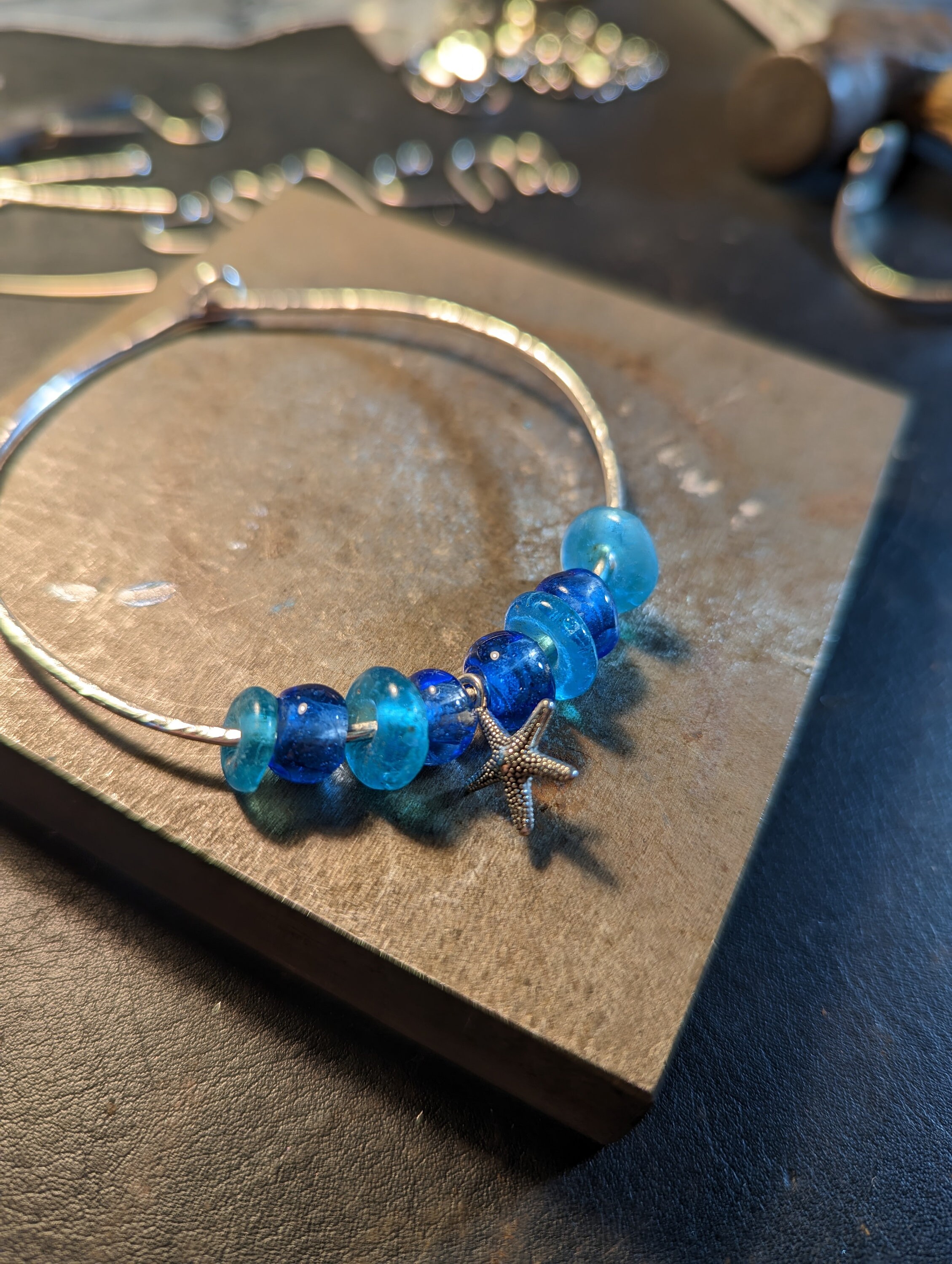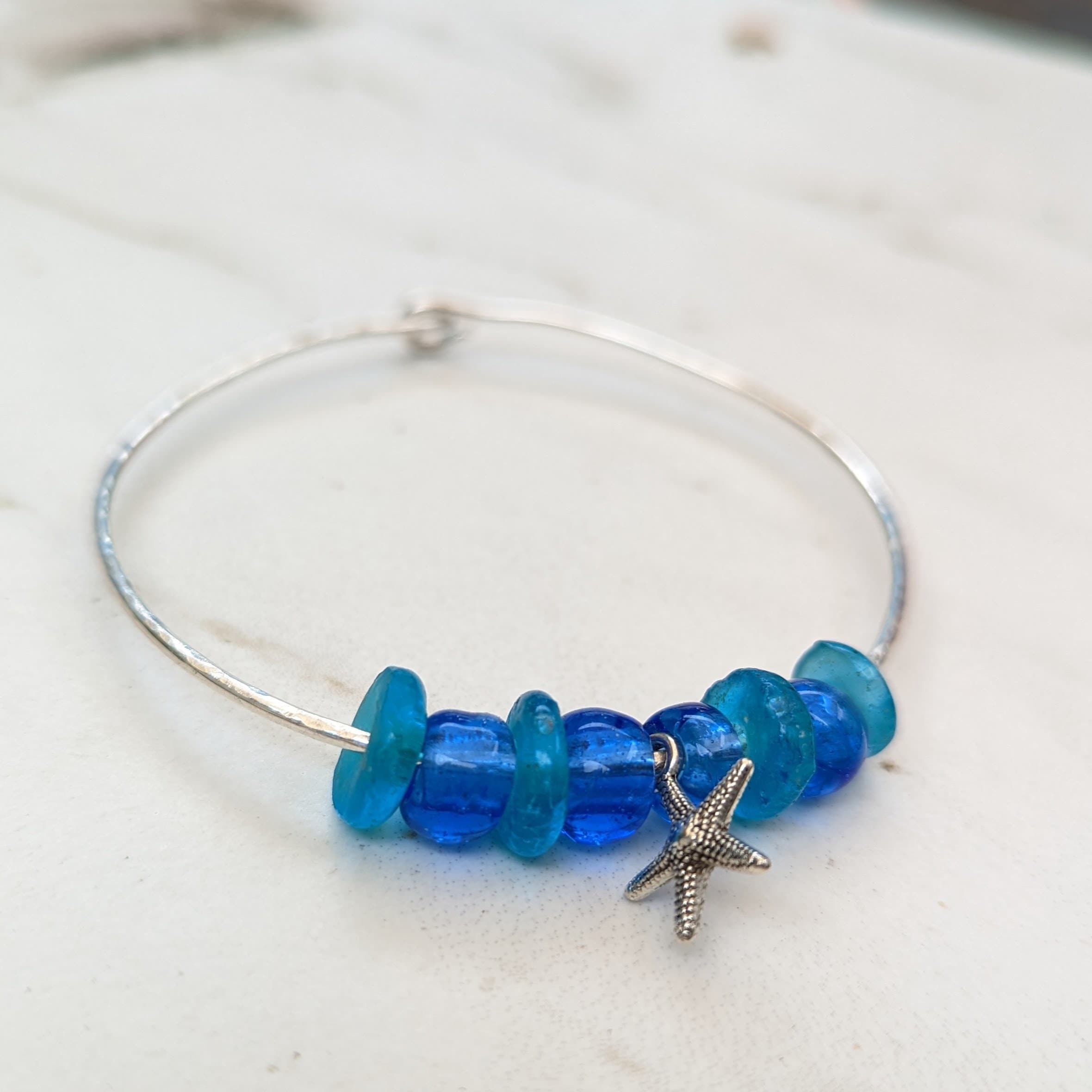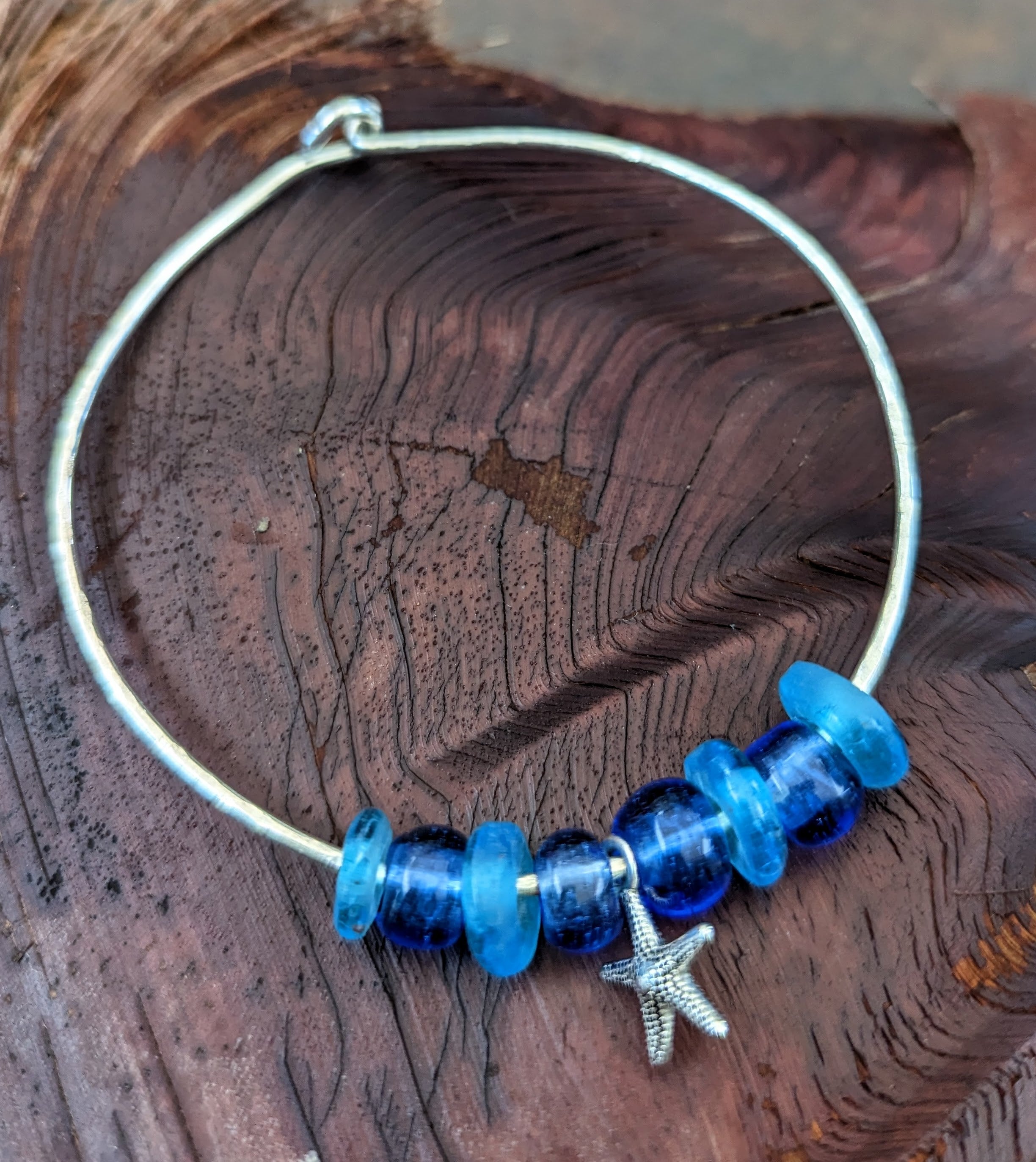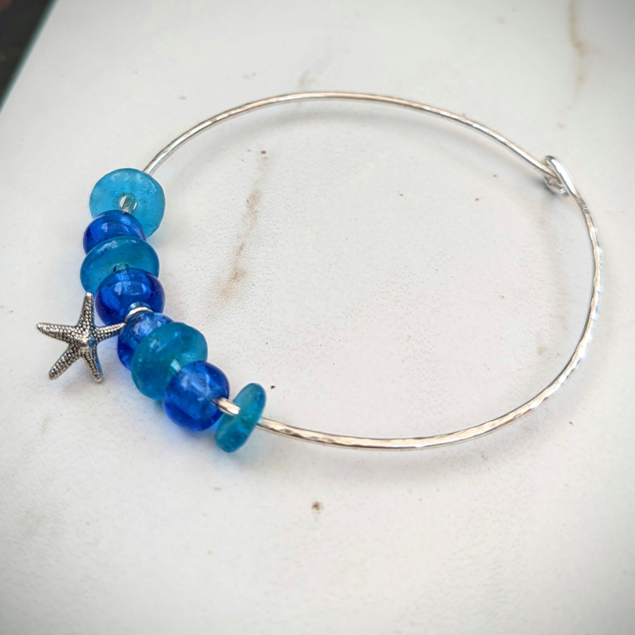 Hand hammered sterling silver bangle bracelet with beautiful ocean blue Ghana Glass donut beads that move freely around the bangle. Ghana glass beads are made in the country of Ghana by artisans that pick up all different glass bottles and recycle them. They crush them to powder and chips and remake the recycled glass into beautiful brightly colored beads. I love pairing them with my hand hammered silver jewelry. This bracelet is finished off with a delicate starfish.