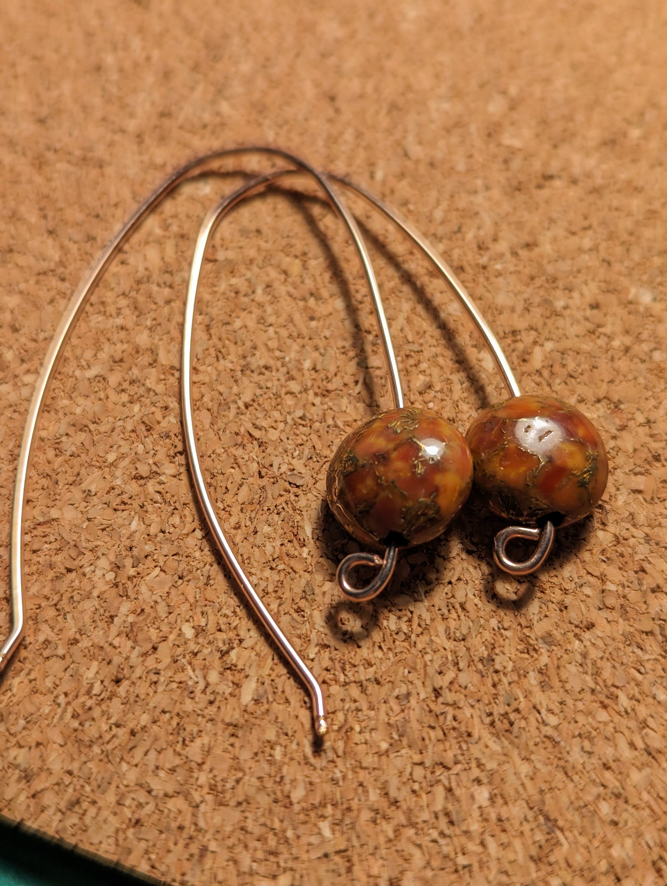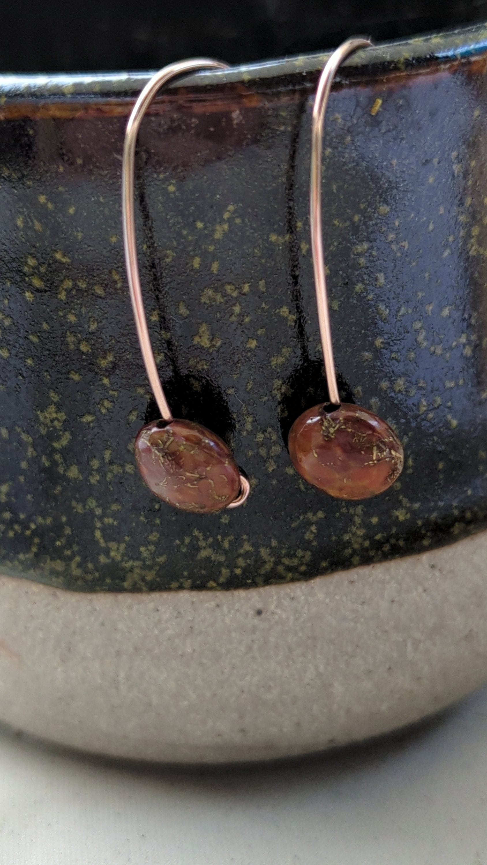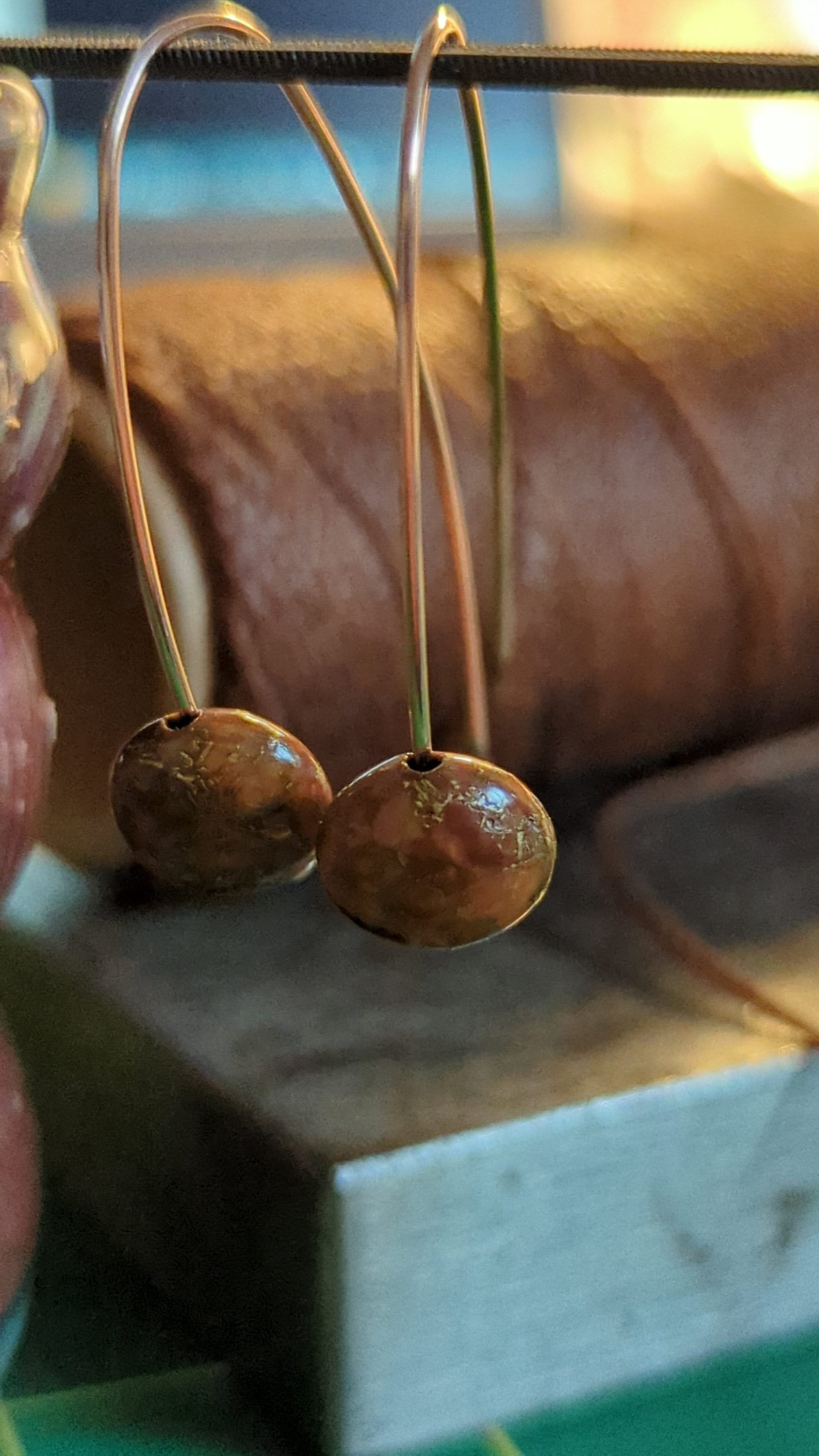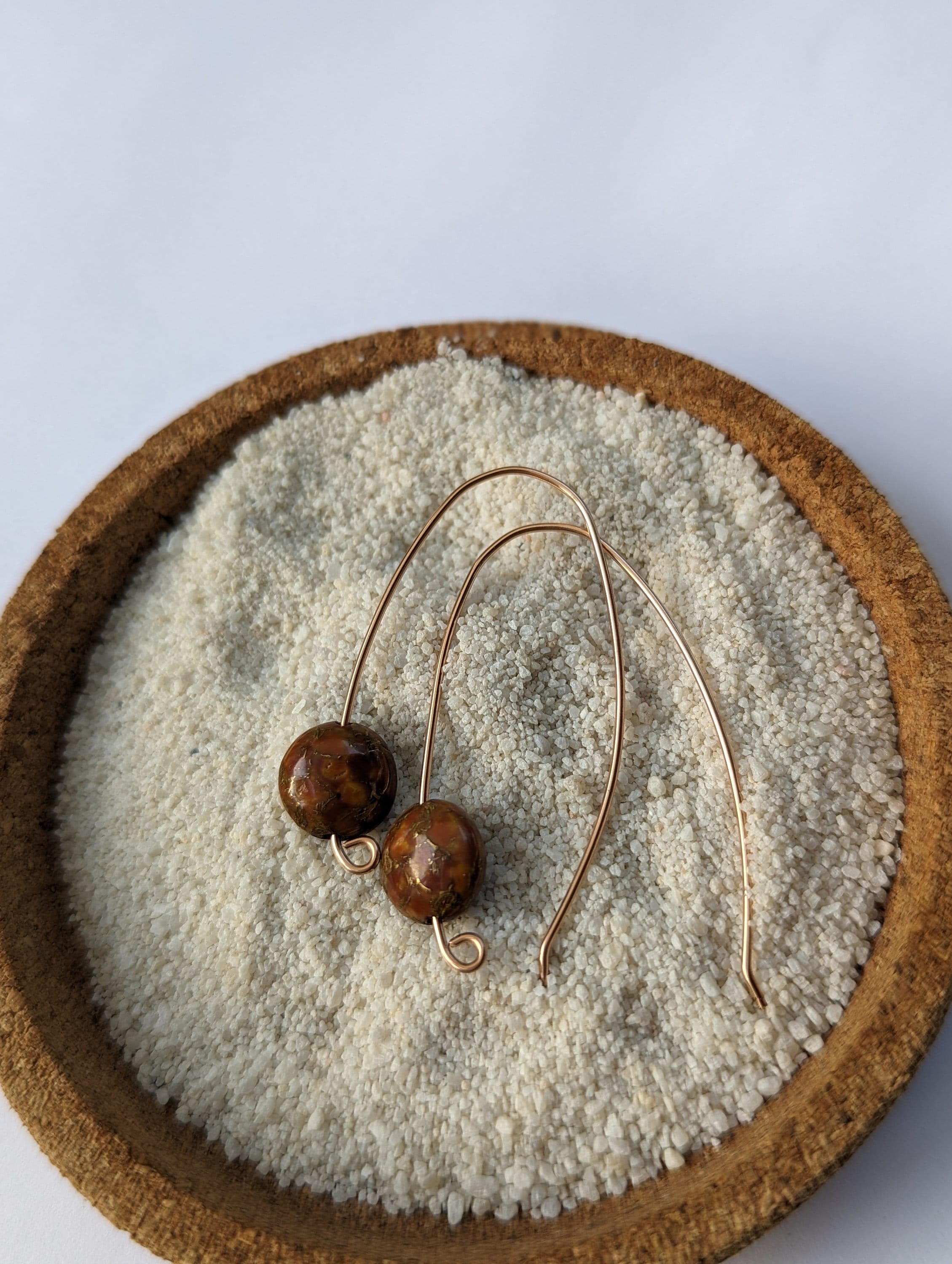Hand hammered rose gold filled earrings dangle in a curl shape with round Brown turquoise stones. I love making all my own unique ear wires by hand. This is an absolutely beautiful stone!