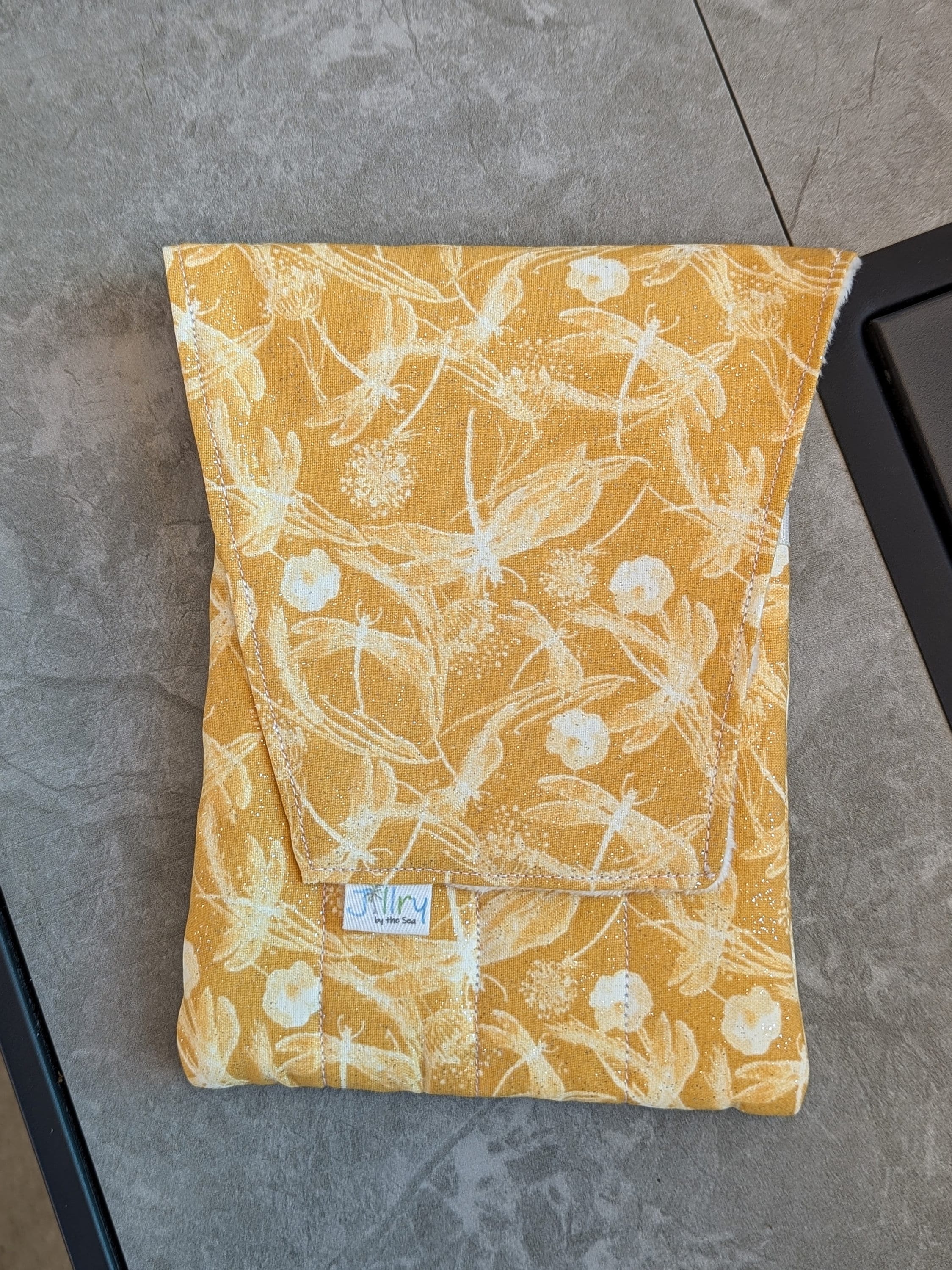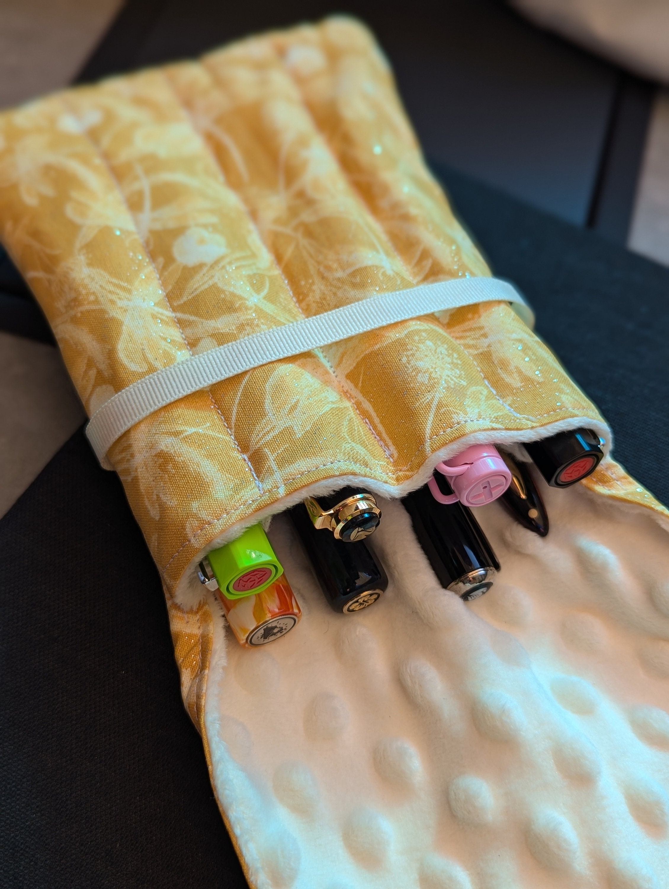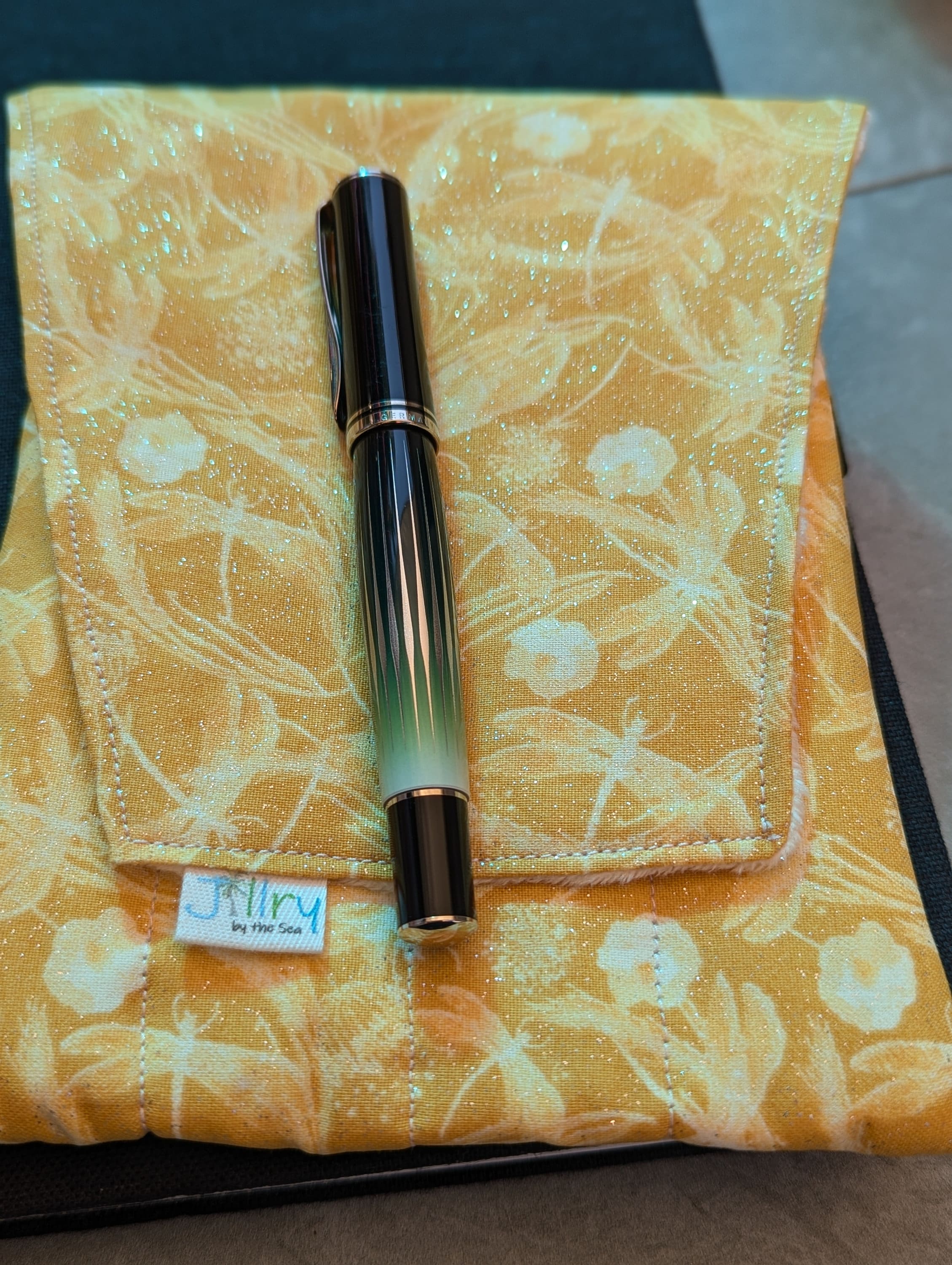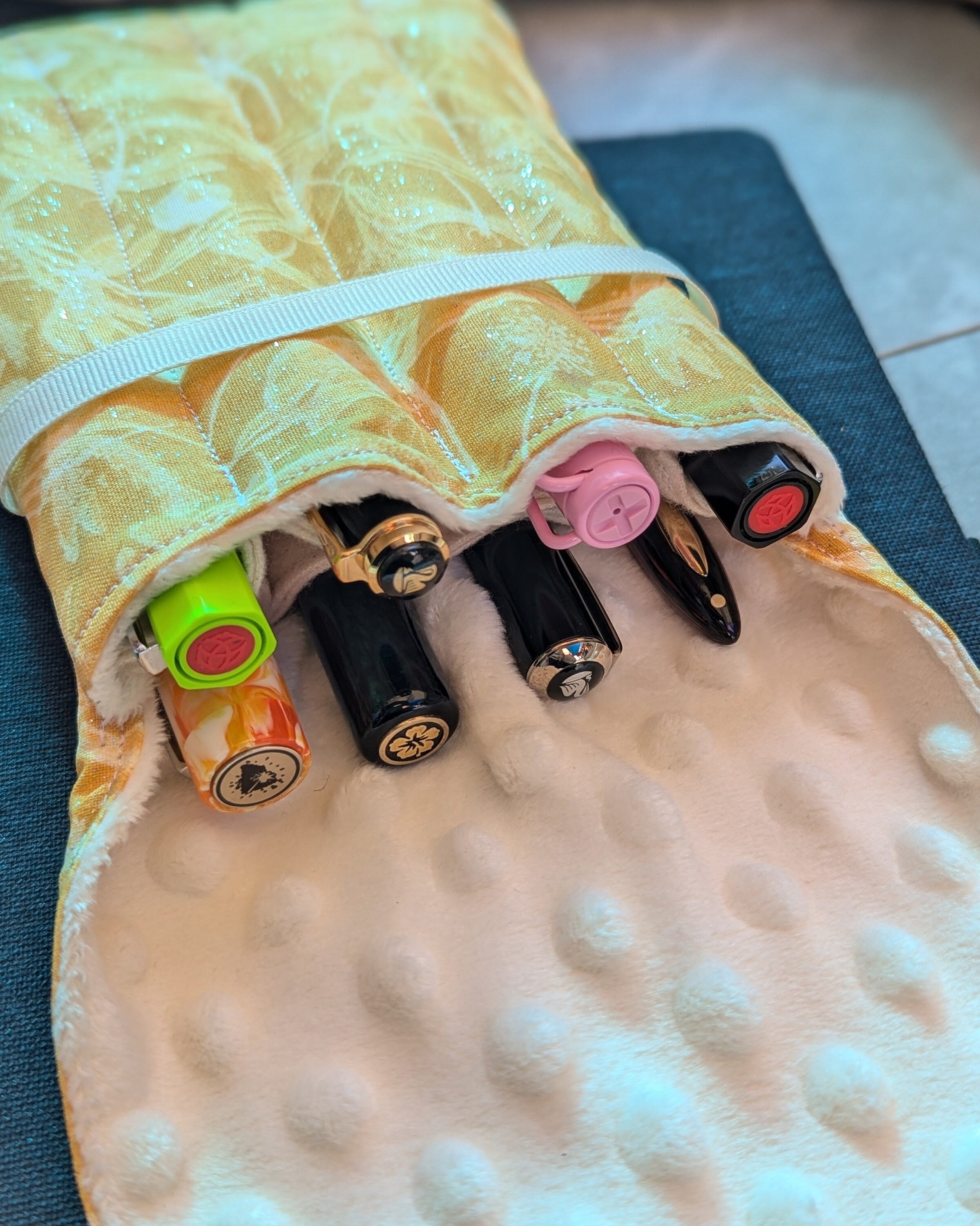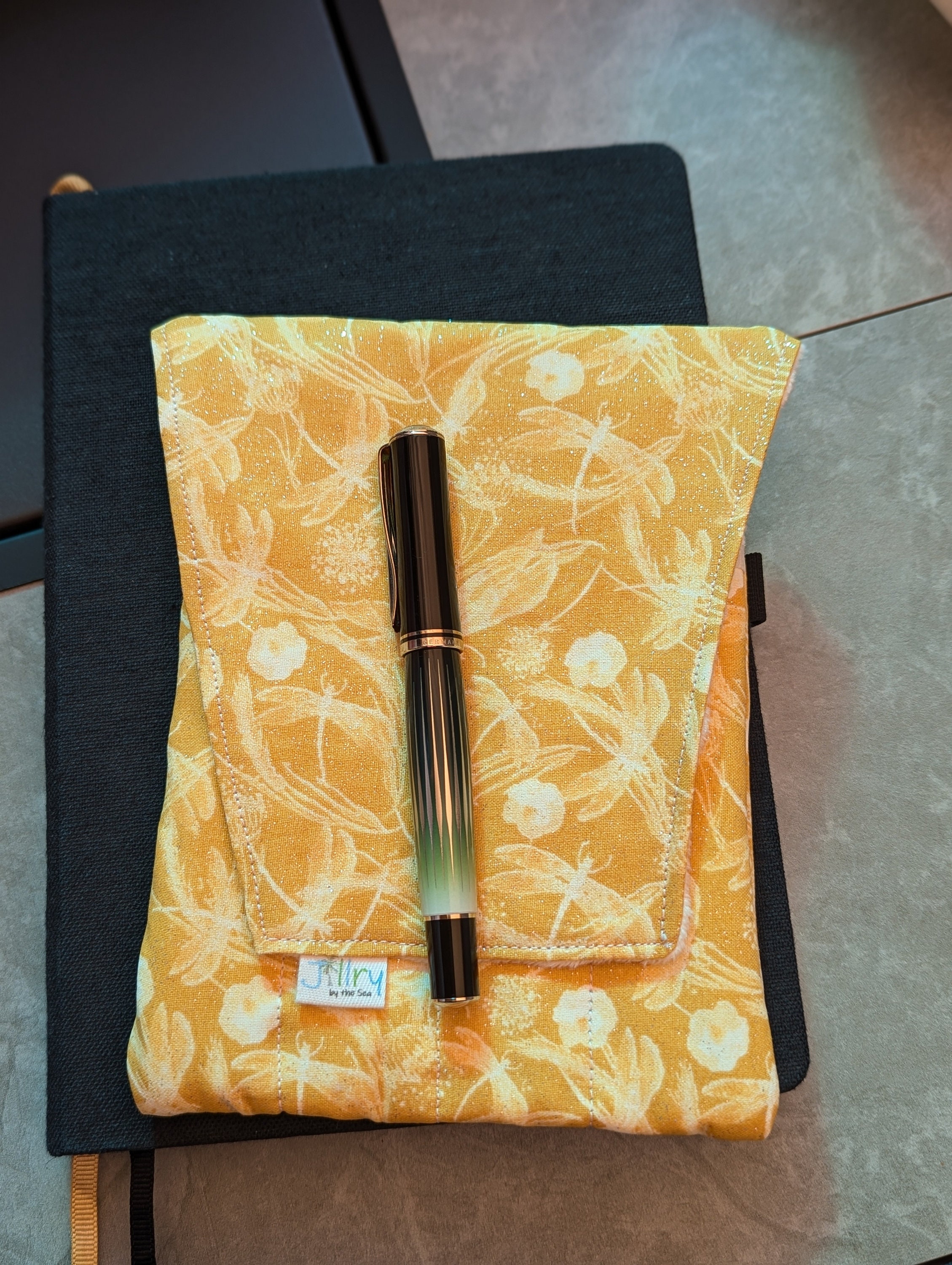 A handmade fabric fountain pen pouch that will hold all your pens and your notebook, too! Beautiful cotton Dragonfly Fabric with a little sparkle! This original design holds eight pens in pockets made of soft minky fabric that will protect them from bumping into each other and keep them from being scratched. The pocket is long enough to hold big pens and it even has a center pocket where you can stash a small notebook and your phone!
