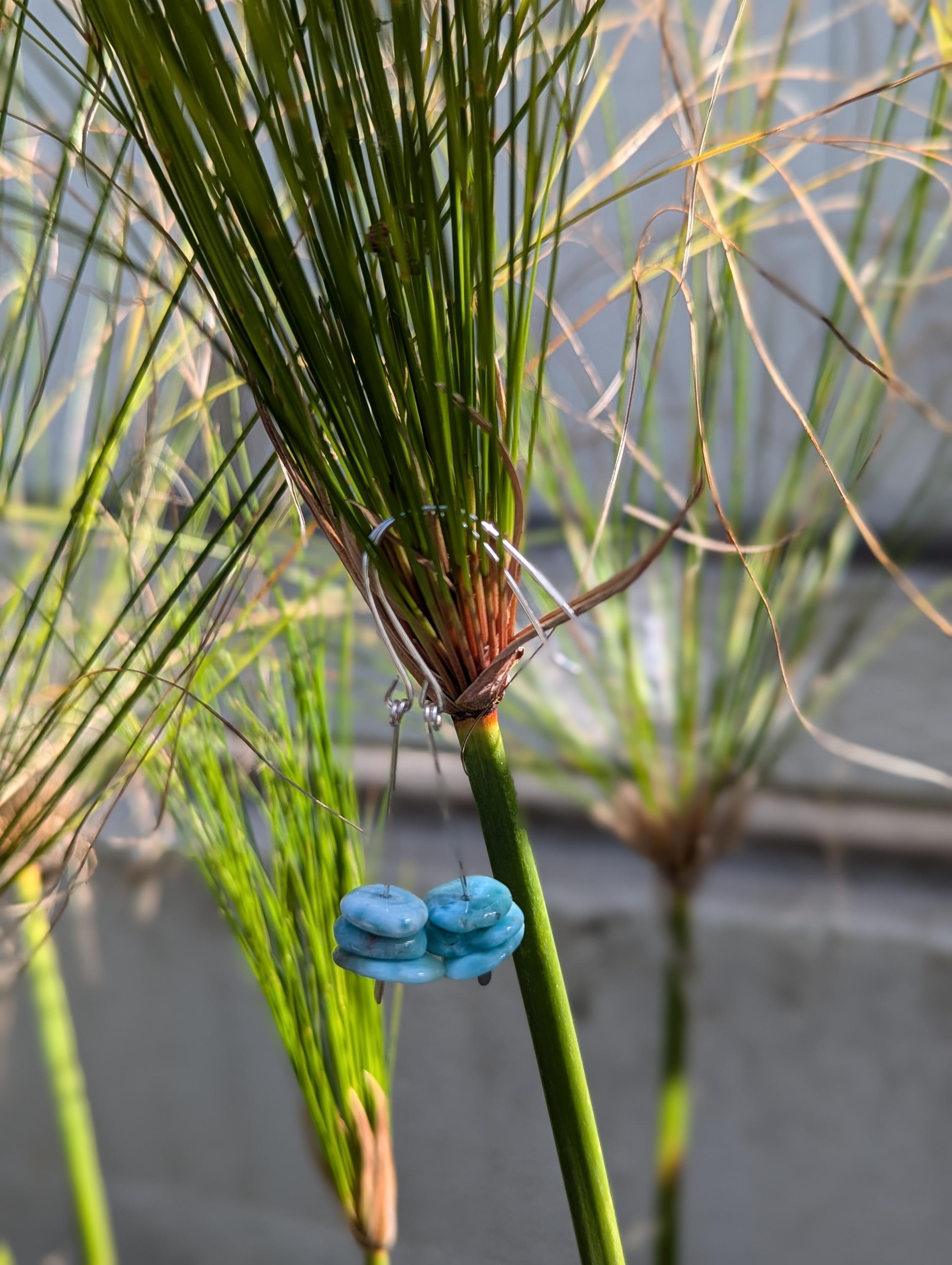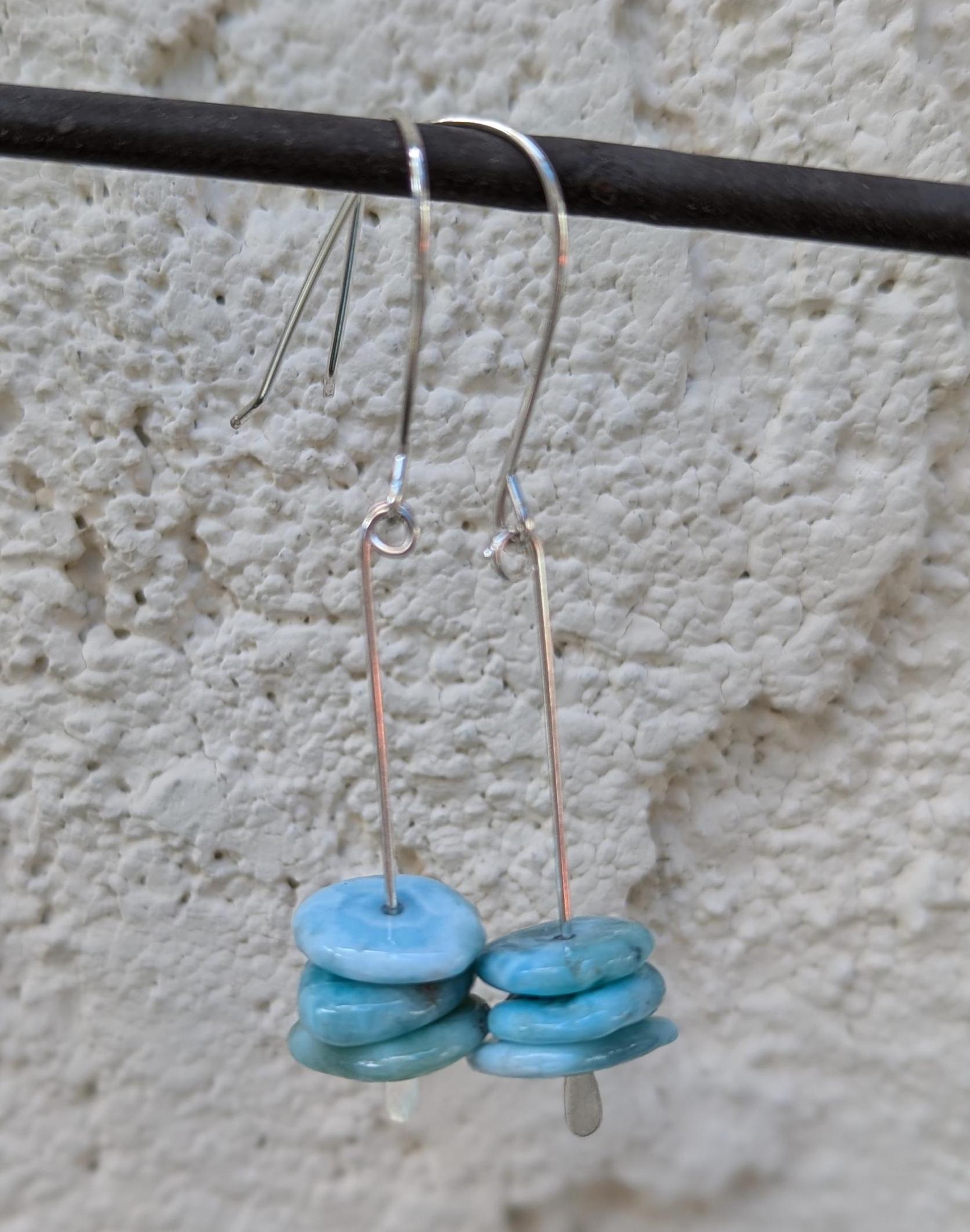 Beautiful blue Larimar disc stones on silver. These have hand hammered Sterling Silver ear wires.