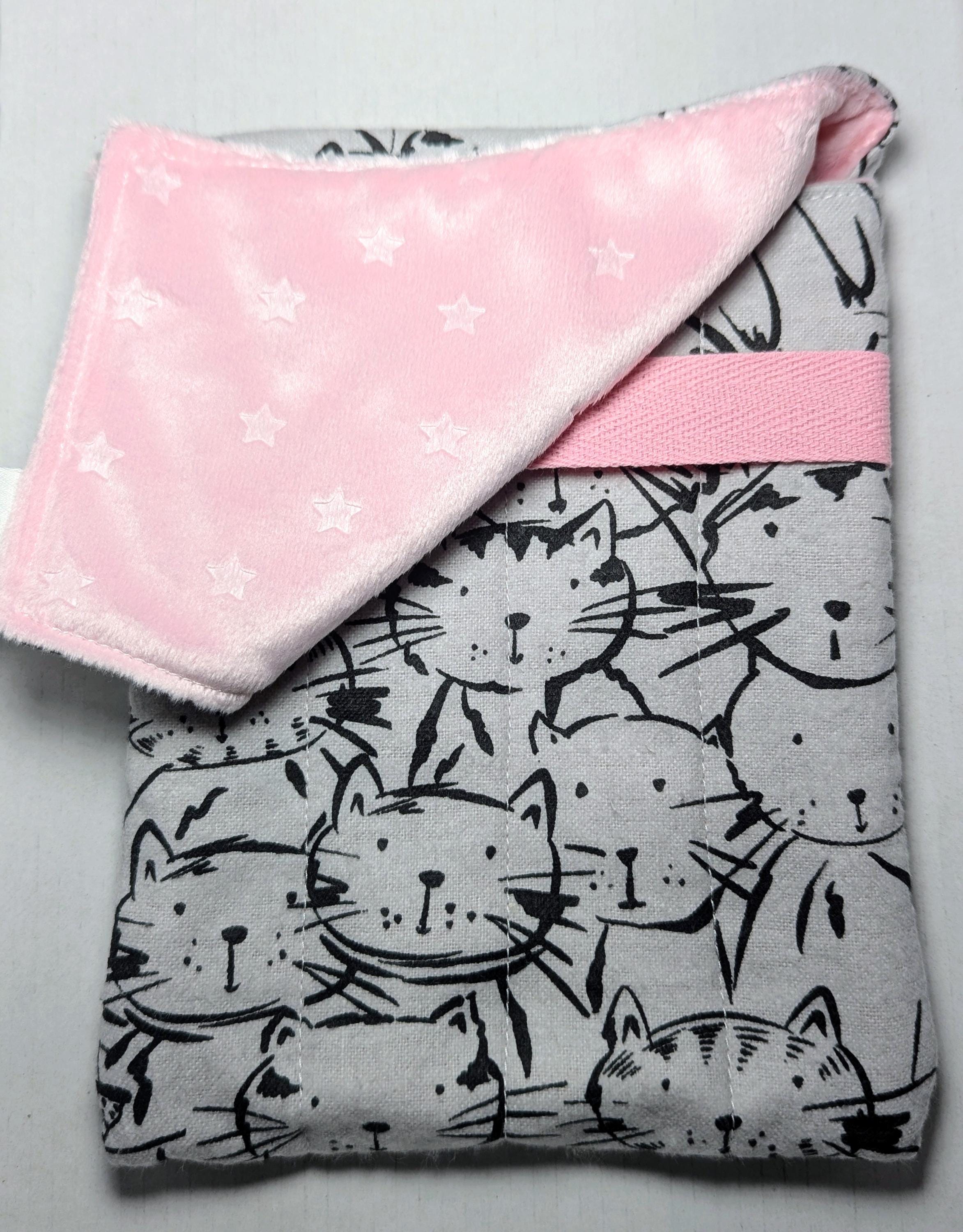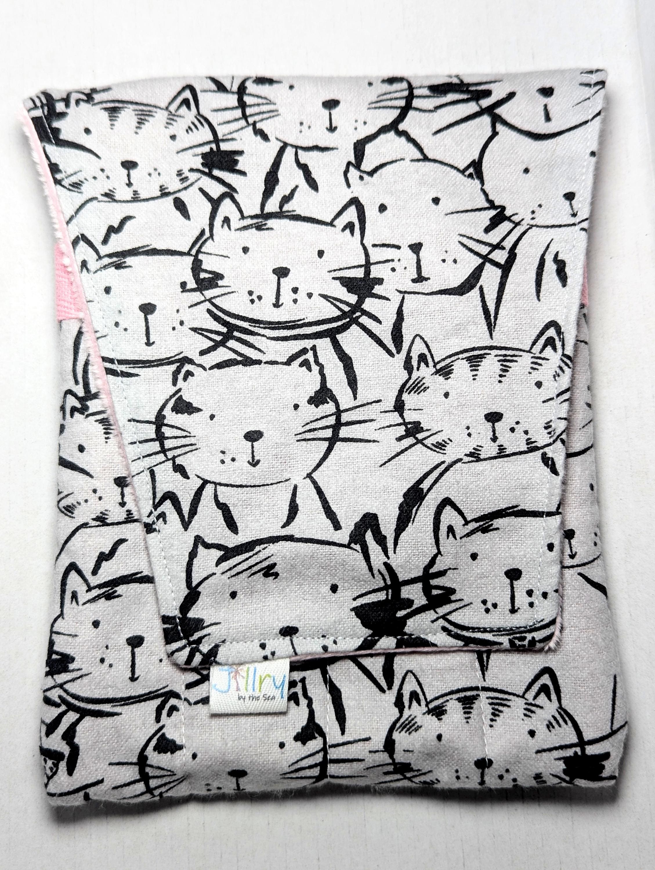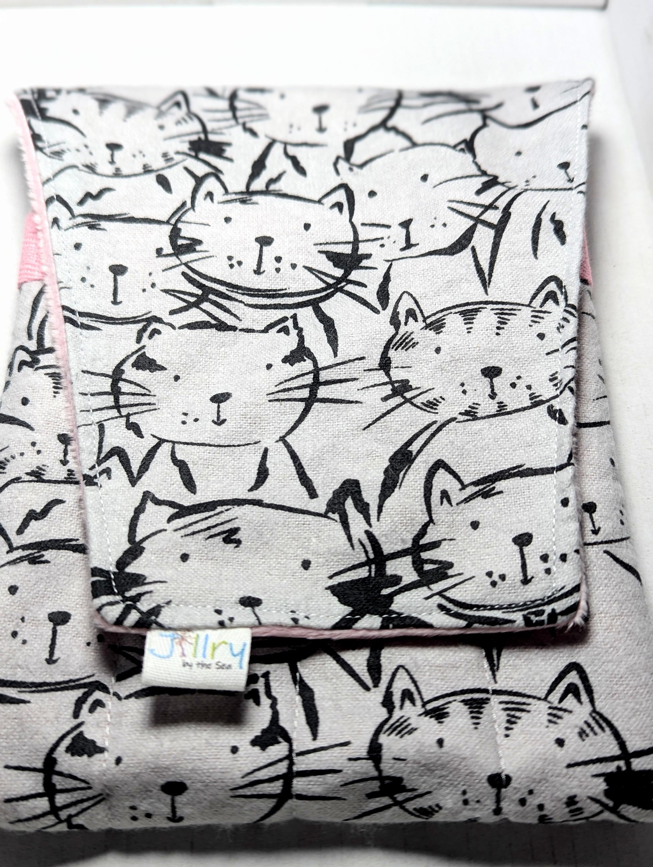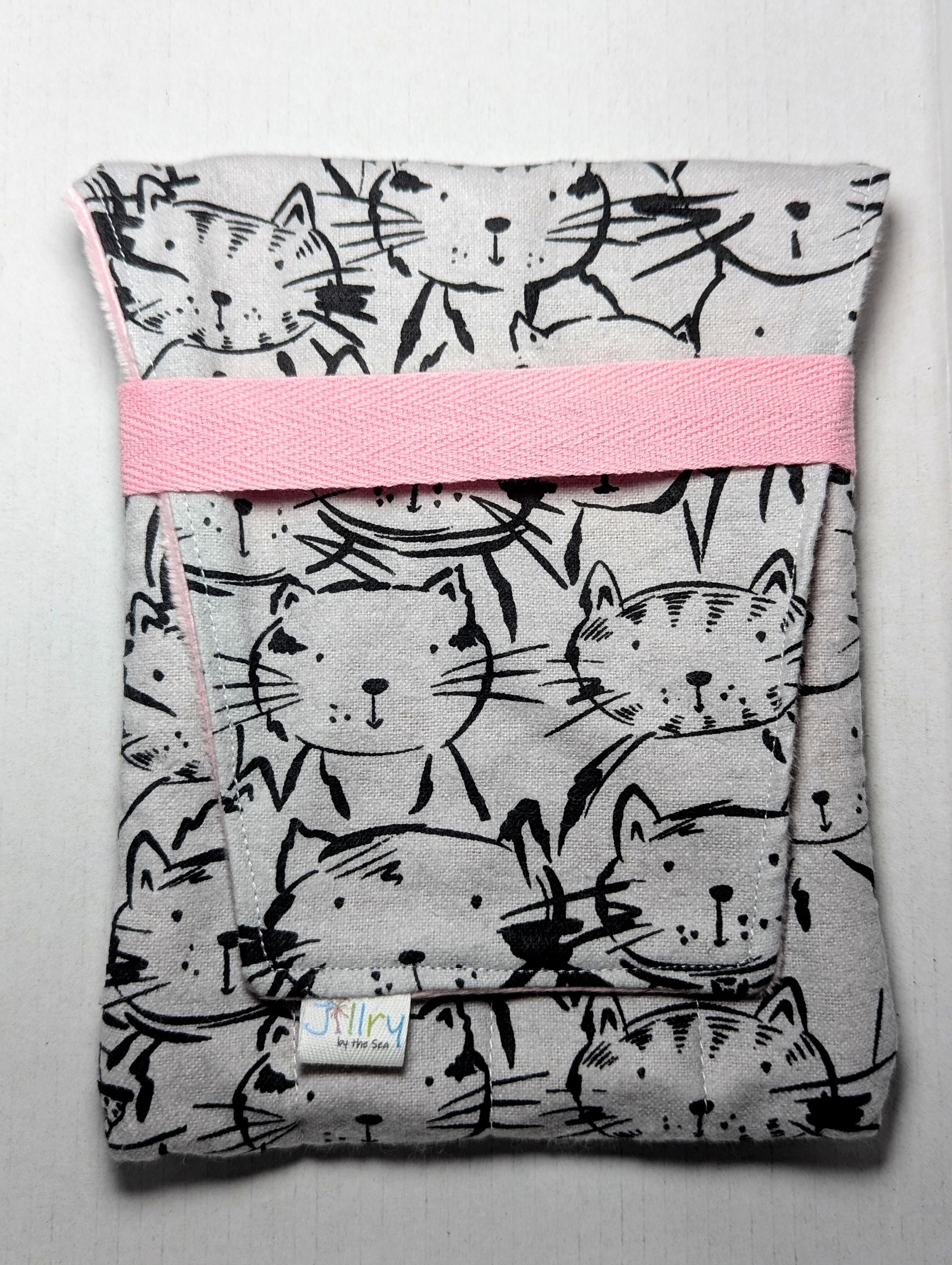 A handmade fabric fountain pen pouch that will hold all your pens and your notebook, too! Fun cat fabrics! This original design holds eight pens in pockets made of soft minky fabric that will protect them from bumping into each other and keep them from being scratched. The pocket is long enough to hold big pens and it even has a center pocket where you can stash a small notebook and your phone!