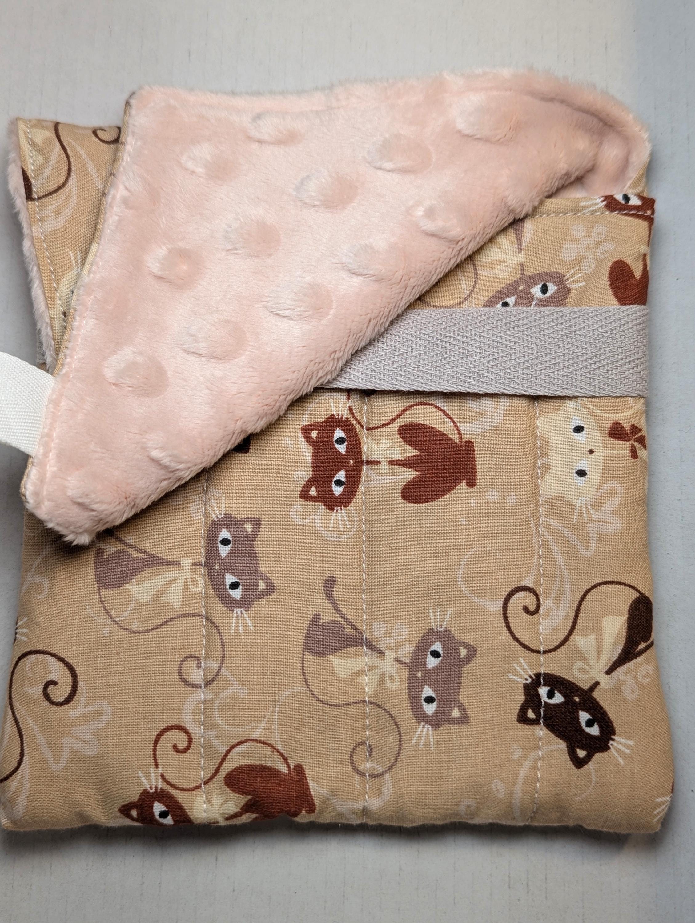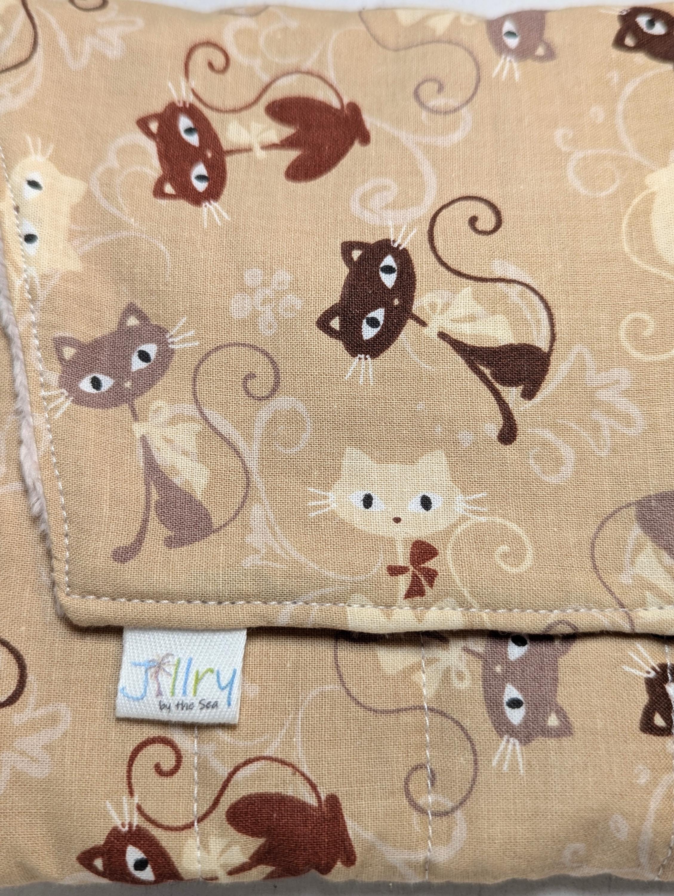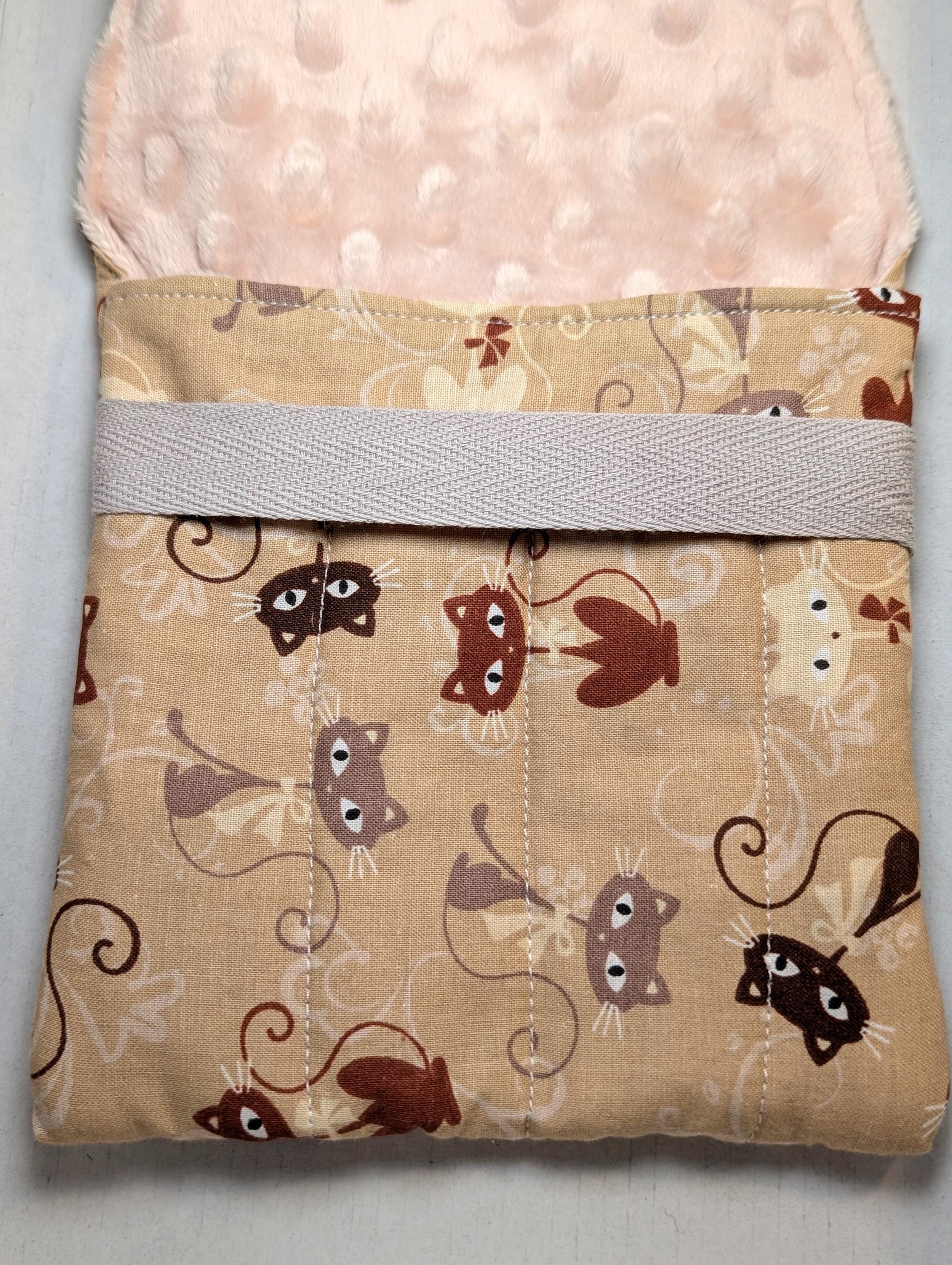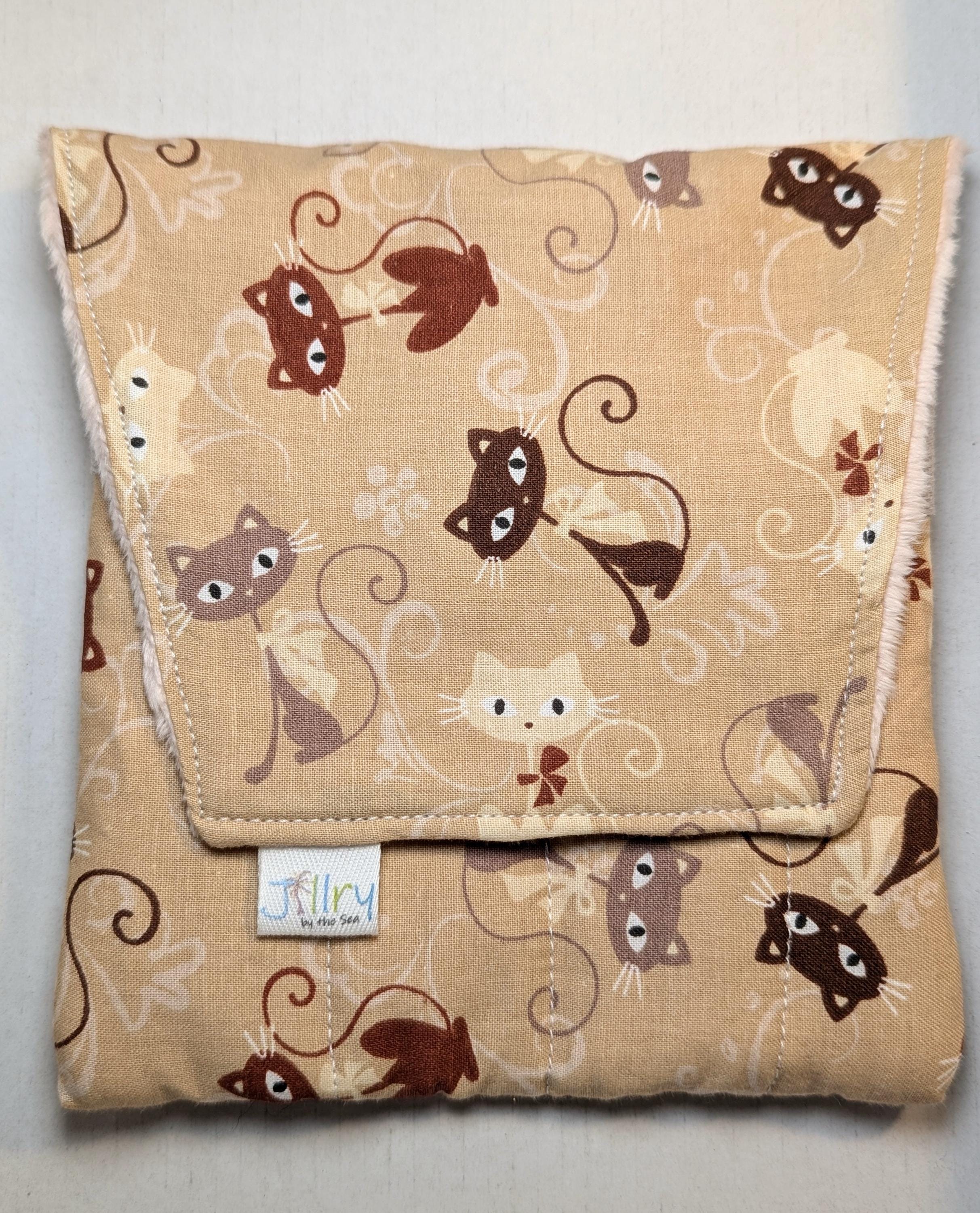 A handmade fabric fountain pen pouch that will hold all your pens and your notebook, too! Fun cat fabrics! This original design holds eight pens in pockets made of soft minky fabric that will protect them from bumping into each other and keep them from being scratched. The pocket is long enough to hold big pens and it even has a center pocket where you can stash a small notebook and your phone!