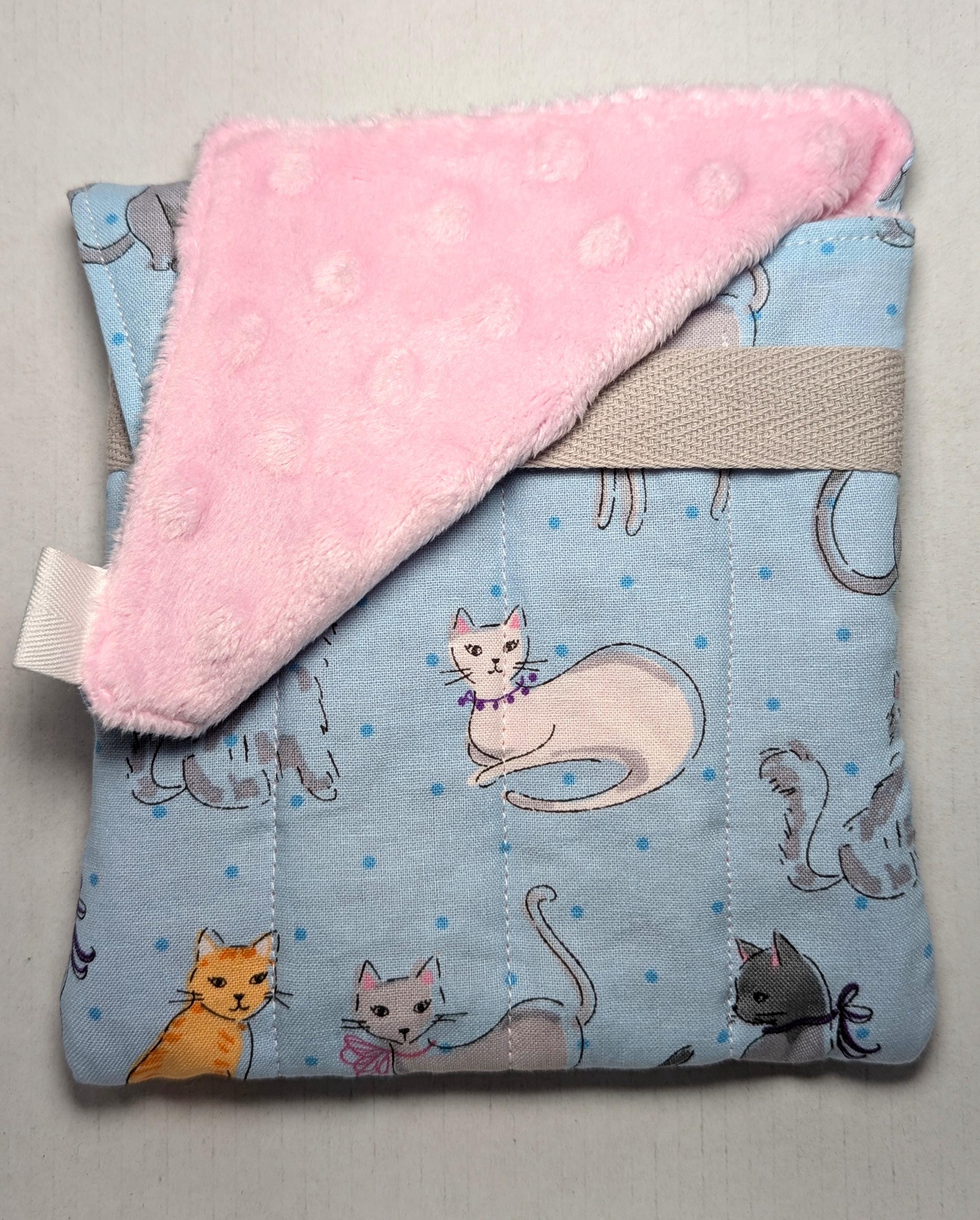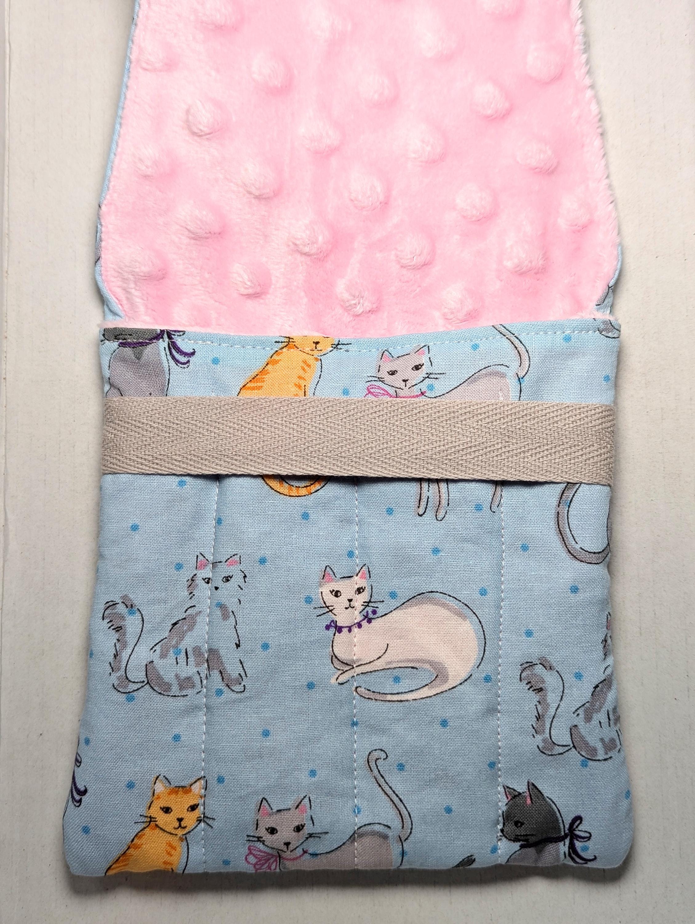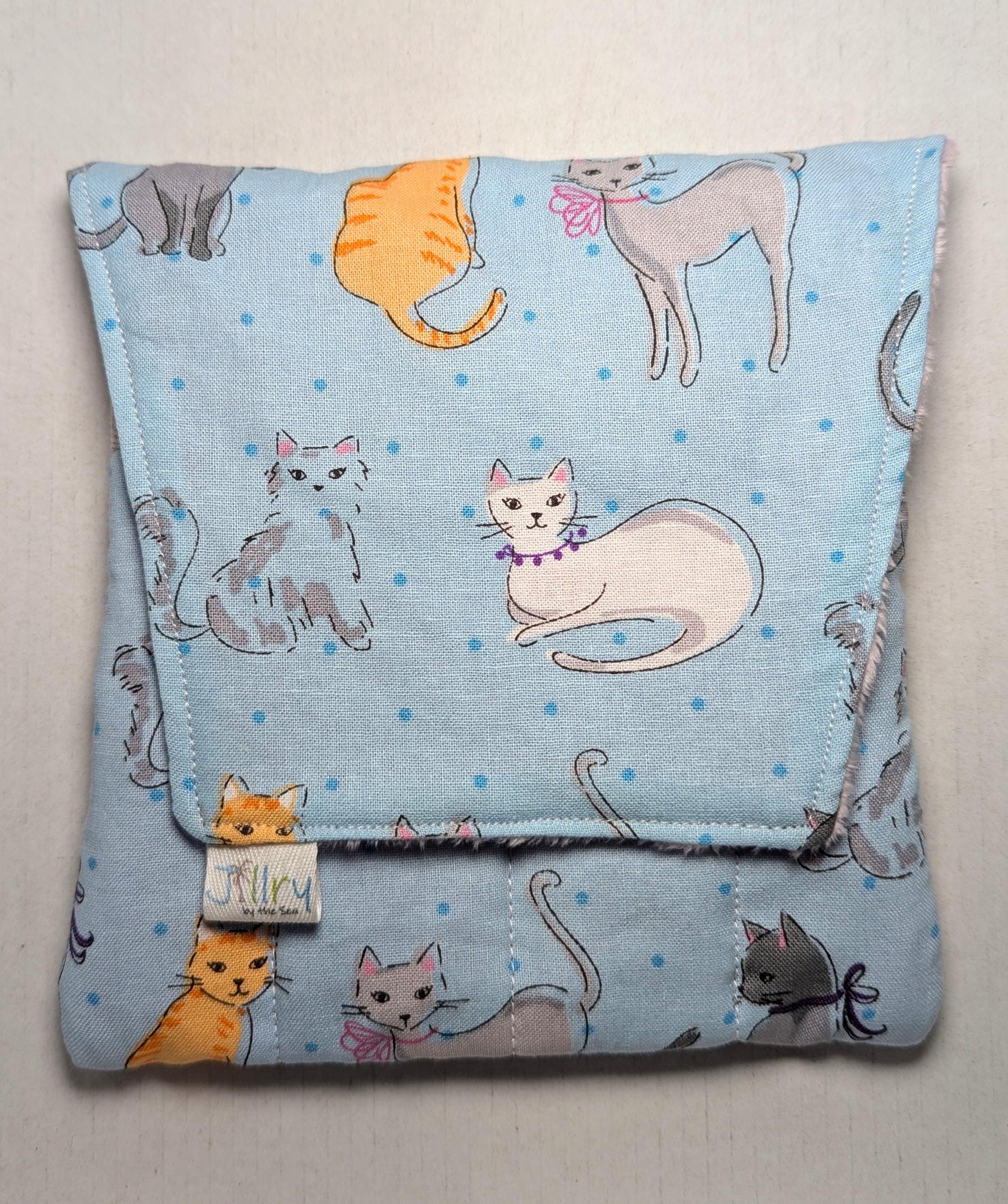 A handmade fabric fountain pen pouch that will hold all your pens and your notebook, too! Fun cat fabrics! This original design holds eight pens in pockets made of soft minky fabric that will protect them from bumping into each other and keep them from being scratched. The pocket is long enough to hold big pens and it even has a center pocket where you can stash a small notebook and your phone!