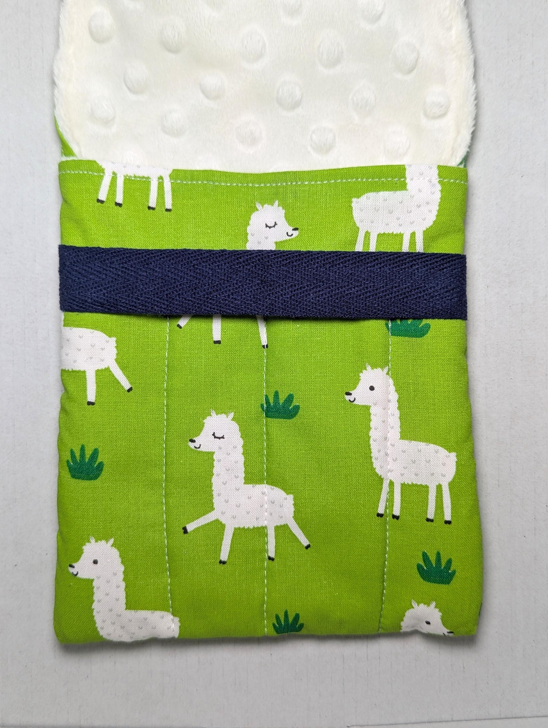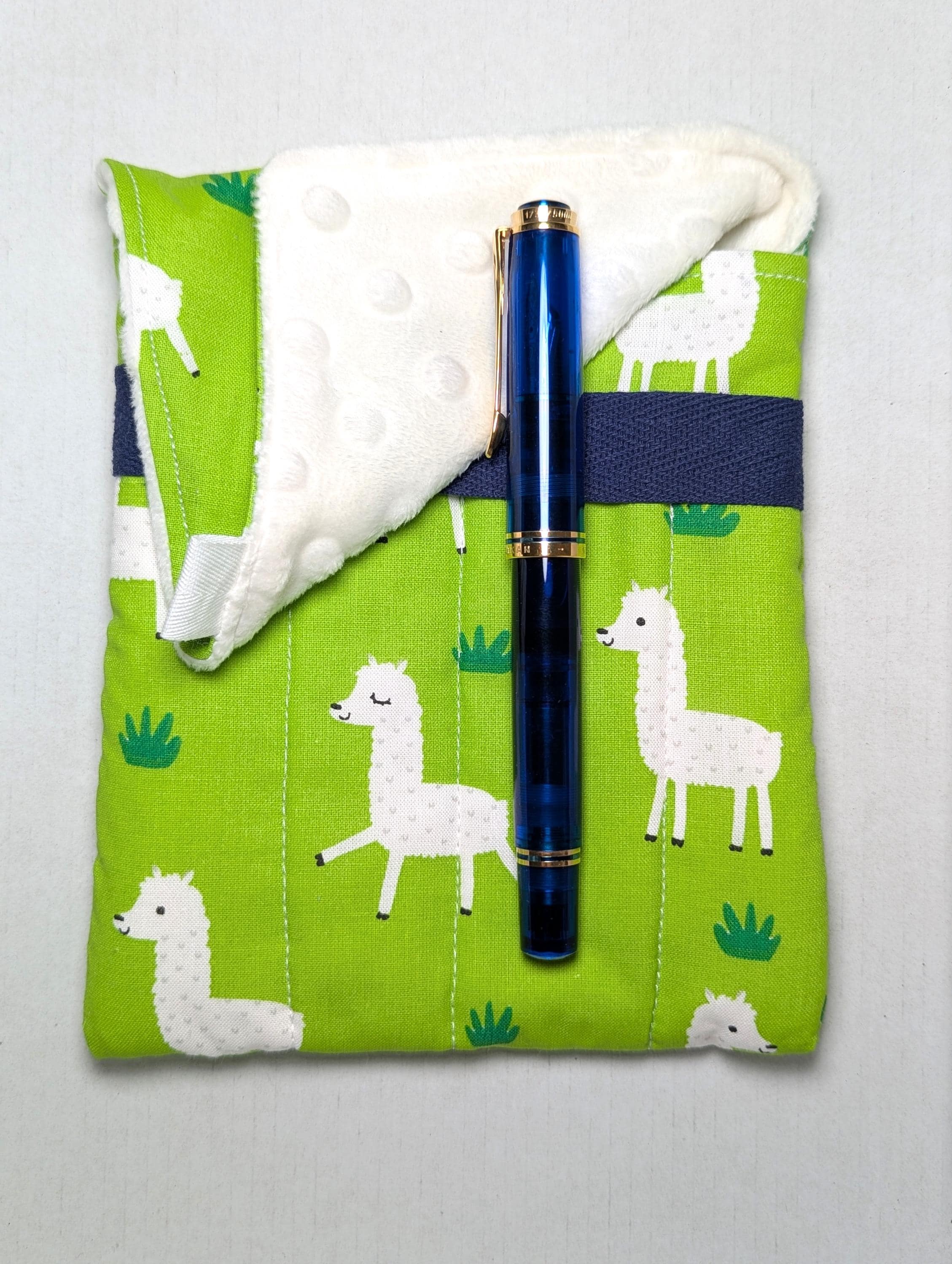 A handmade fabric fountain pen pouch that will hold all your pens and your notebook, too! Fun fabrics! Makes great gifts! This original design holds eight pens in pockets made of soft minky fabric that will protect them from bumping into each other and keep them from being scratched. The pocket even has a center pocket where you can stash a small notebook and your phone!