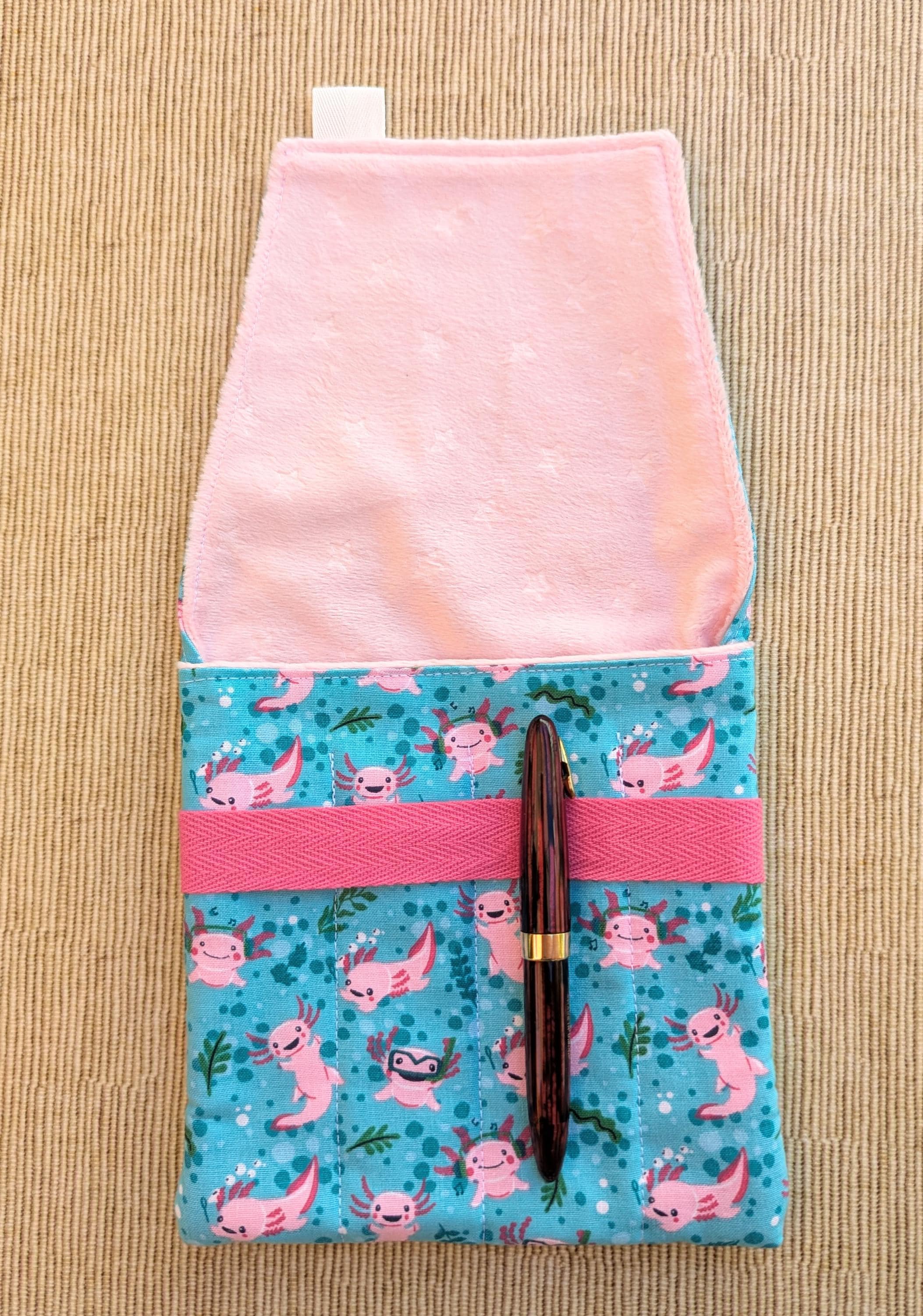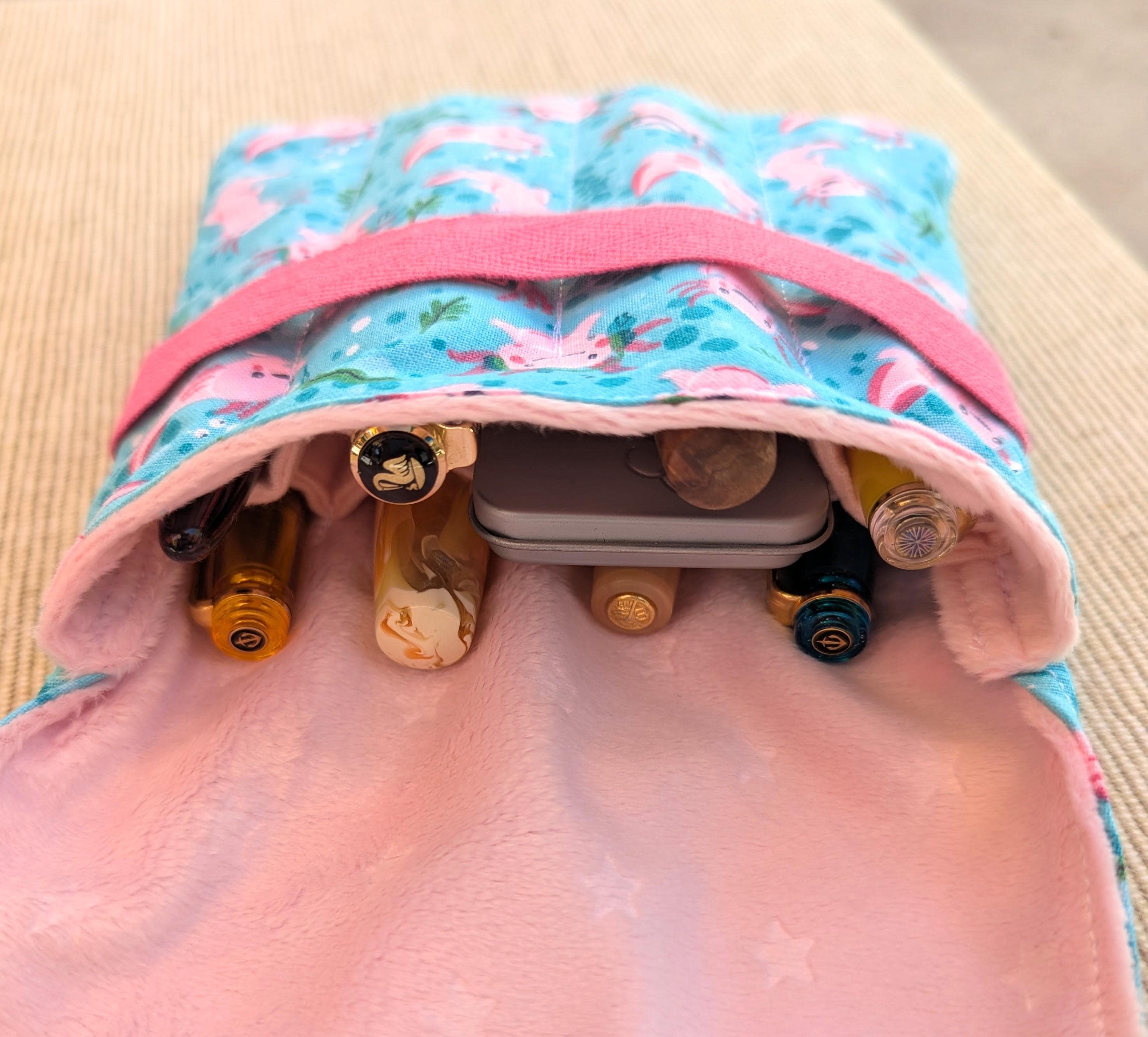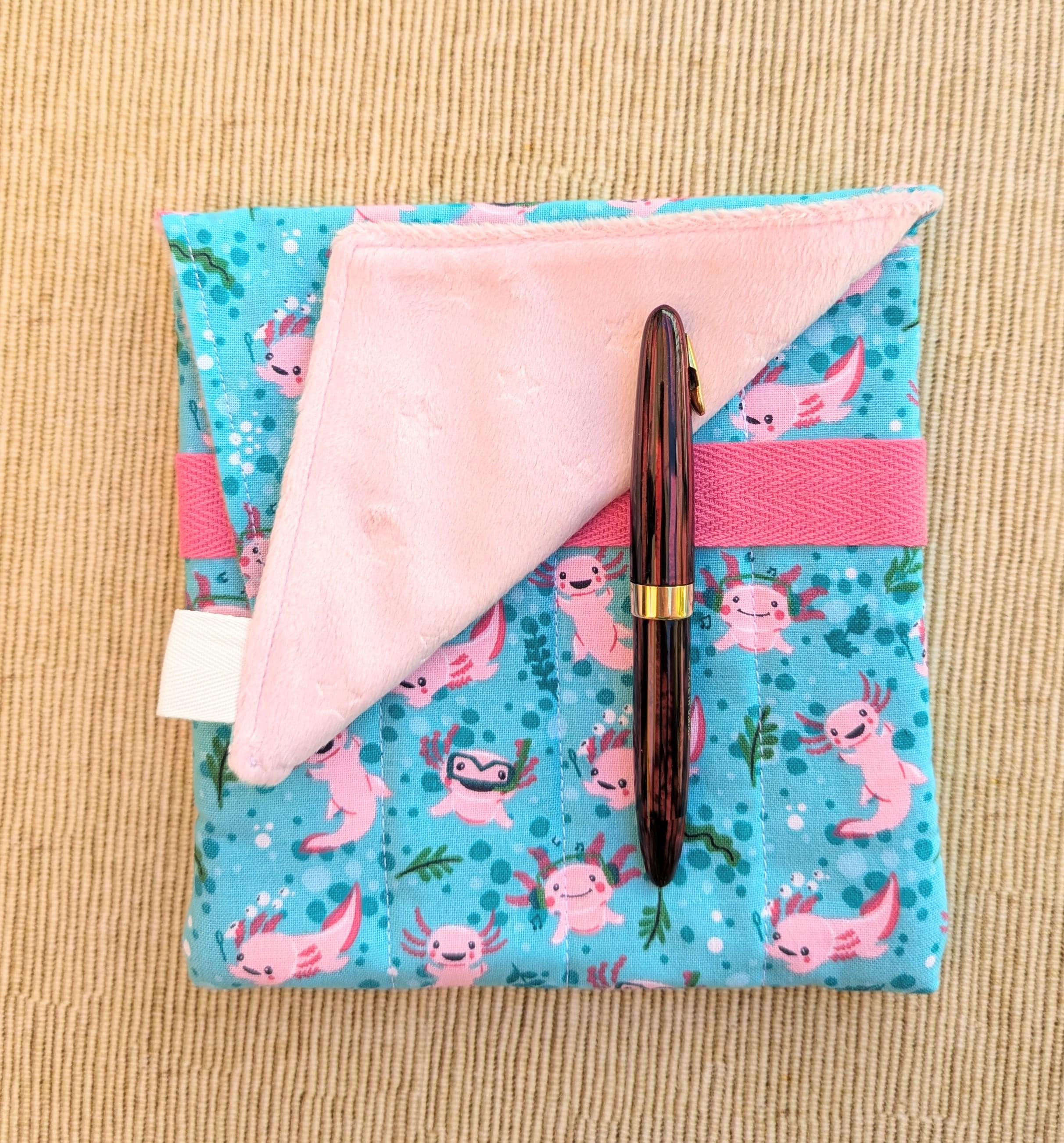 A handmade fabric fountain pen pouch that will hold all your pens and your notebook, too! Fun fabrics! This original design holds eight pens in pockets made of soft minky fabric that will protect them from bumping into each other and keep them from being scratched. The pocket is long enough to hold big pens and it even has a center pocket where you can stash a small notebook and your phone!