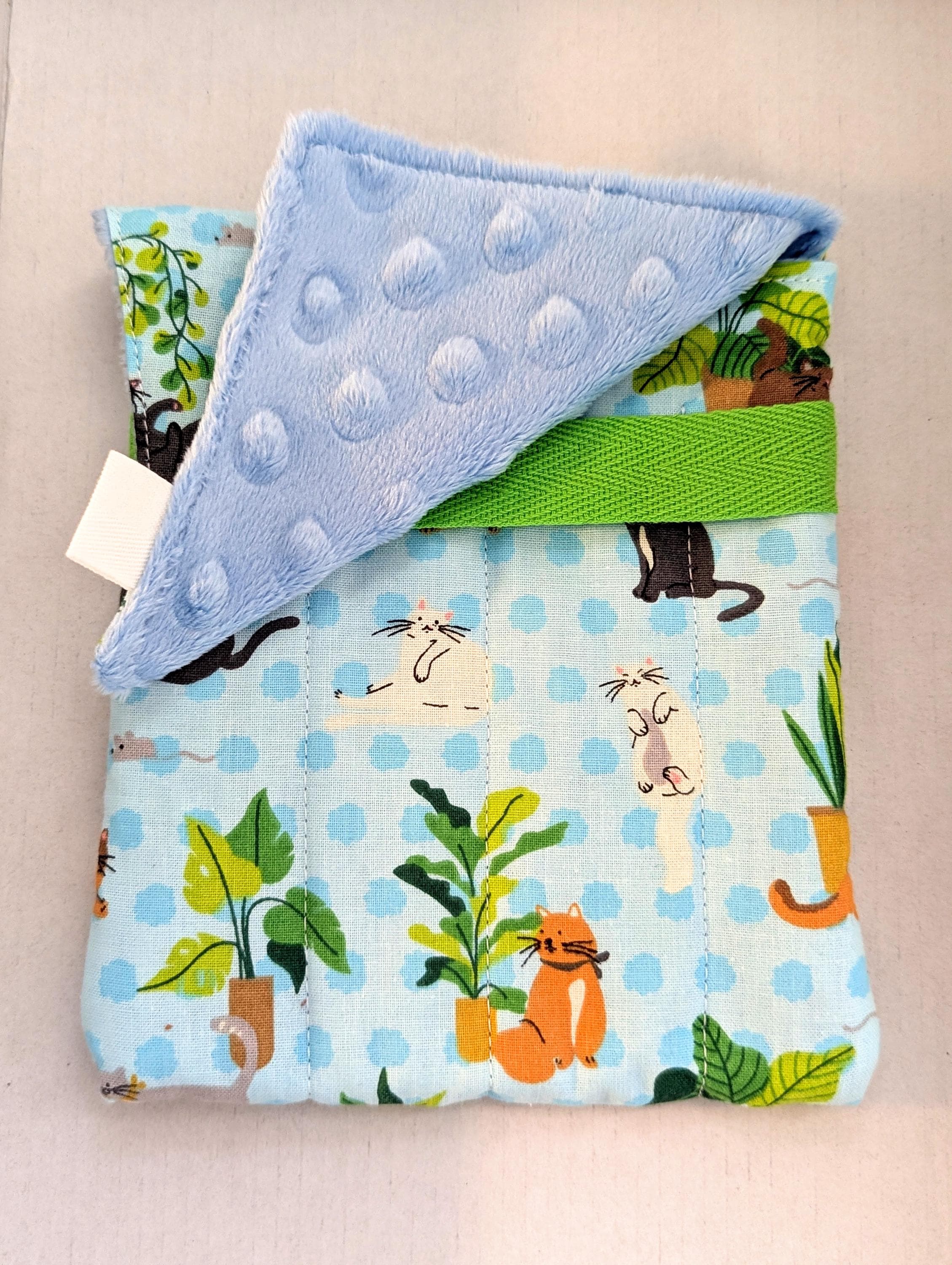 A handmade fabric fountain pen pouch that will hold all your pens and your notebook, too! Fun cat fabrics! This original design holds eight pens in pockets made of soft minky fabric that will protect them from bumping into each other and keep them from being scratched. The pocket is long enough to hold big pens and it even has a center pocket where you can stash a small notebook and your phone!