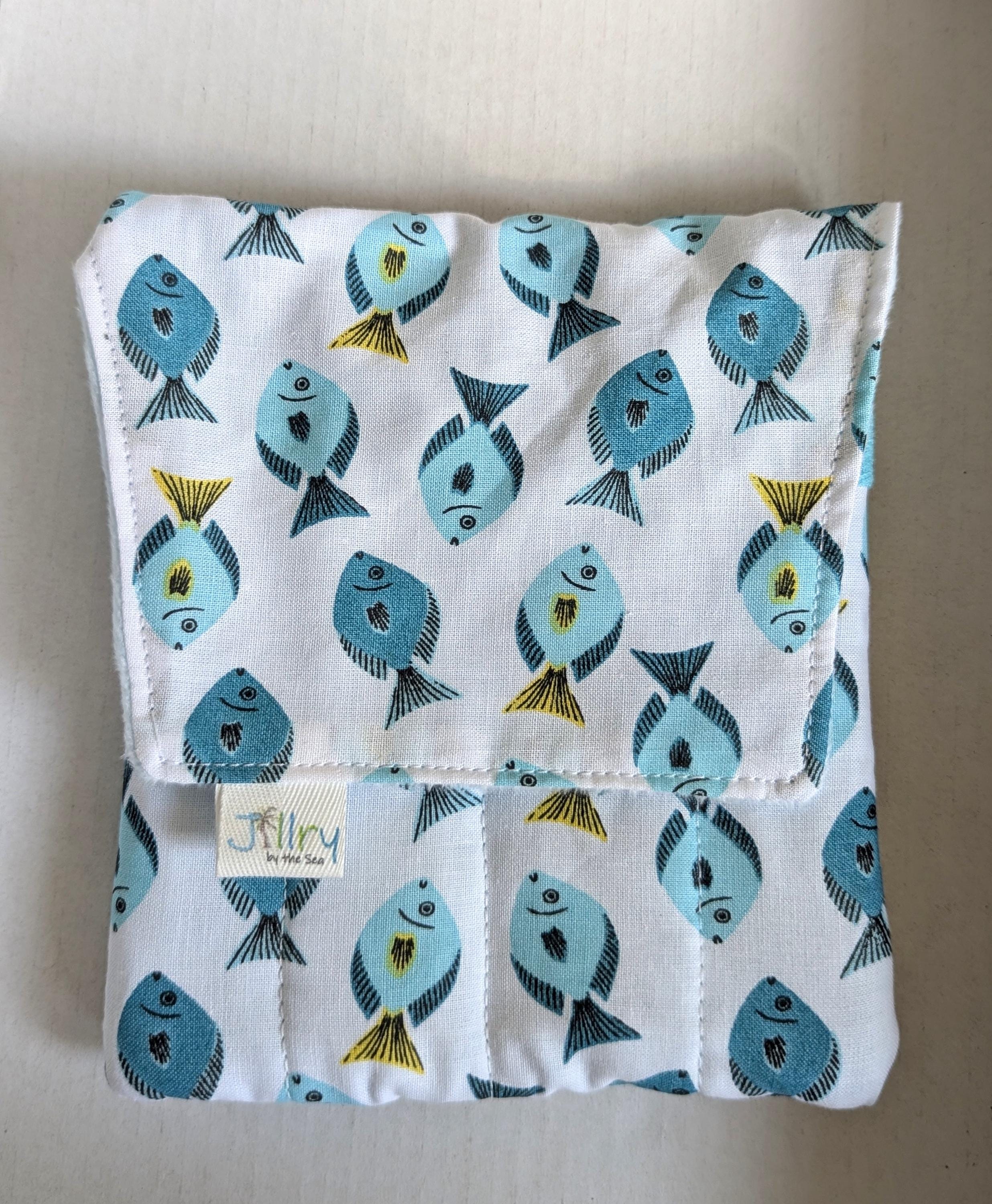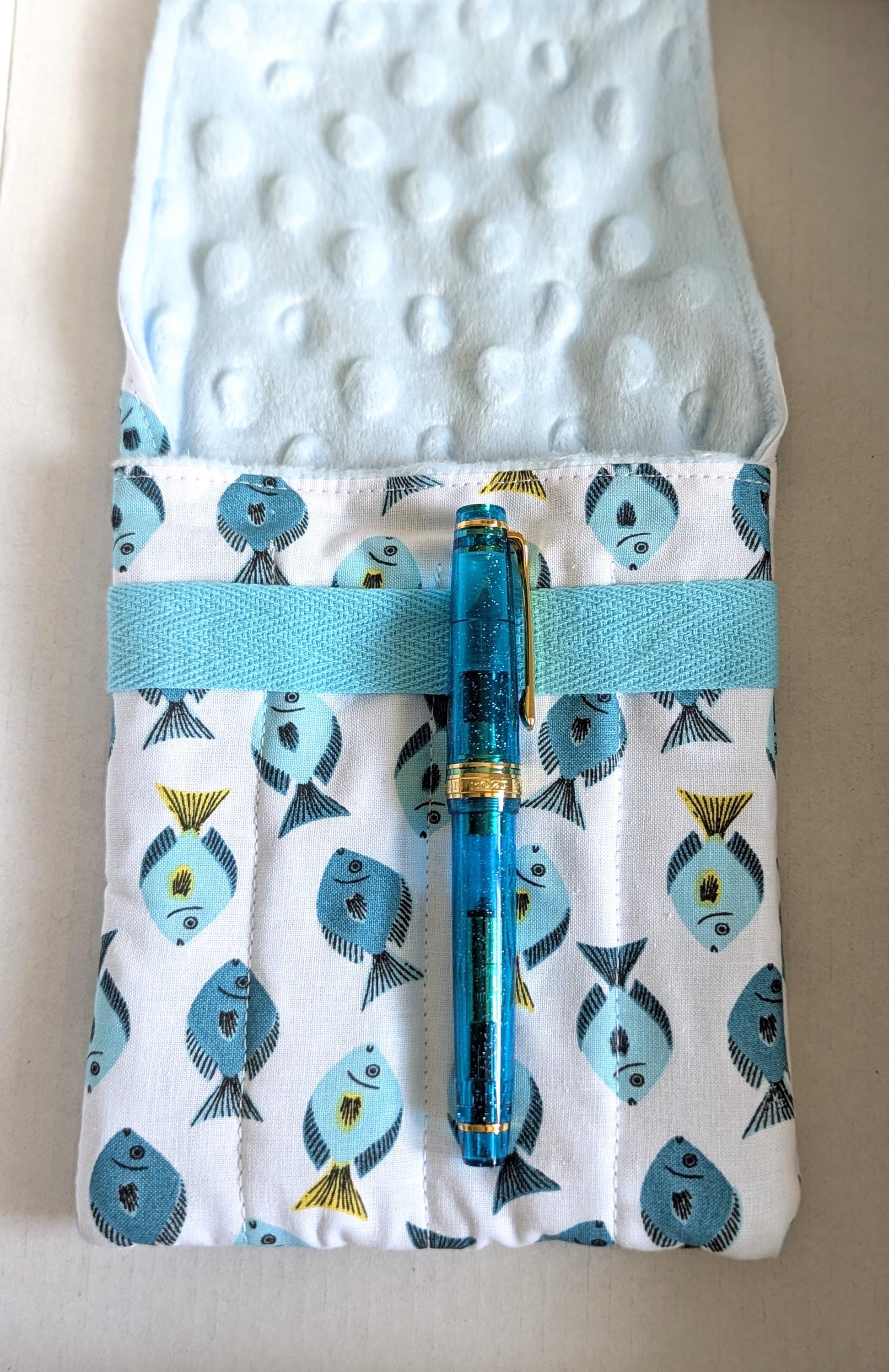 A handmade fabric fountain pen pouch that will hold all your pens and your notebook, too! Fun fabrics! Makes great gifts! This original design holds eight pens in pockets made of soft minky fabric that will protect them from bumping into each other and keep them from being scratched. The pocket even has a center pocket where you can stash a small notebook and your phone!