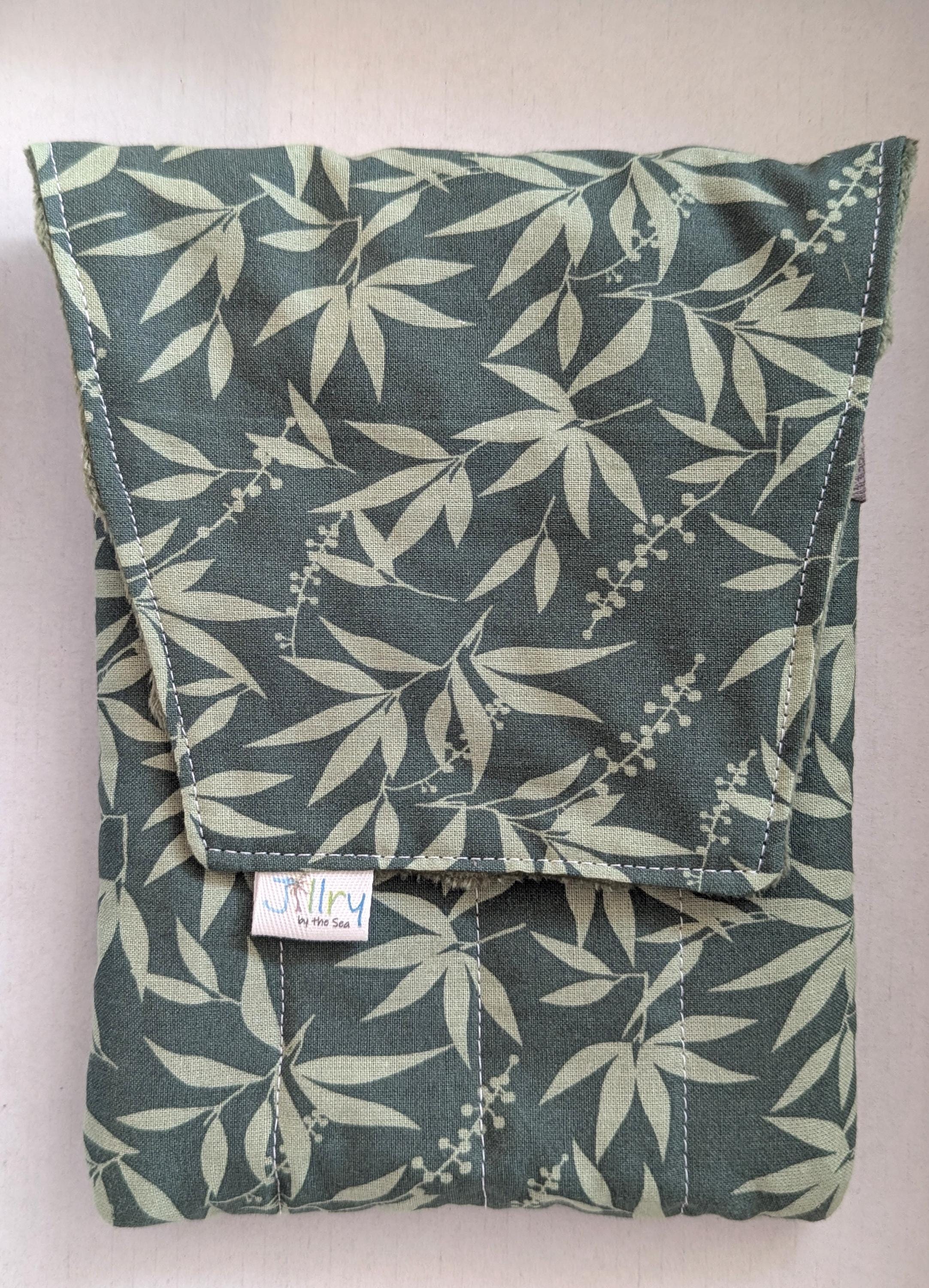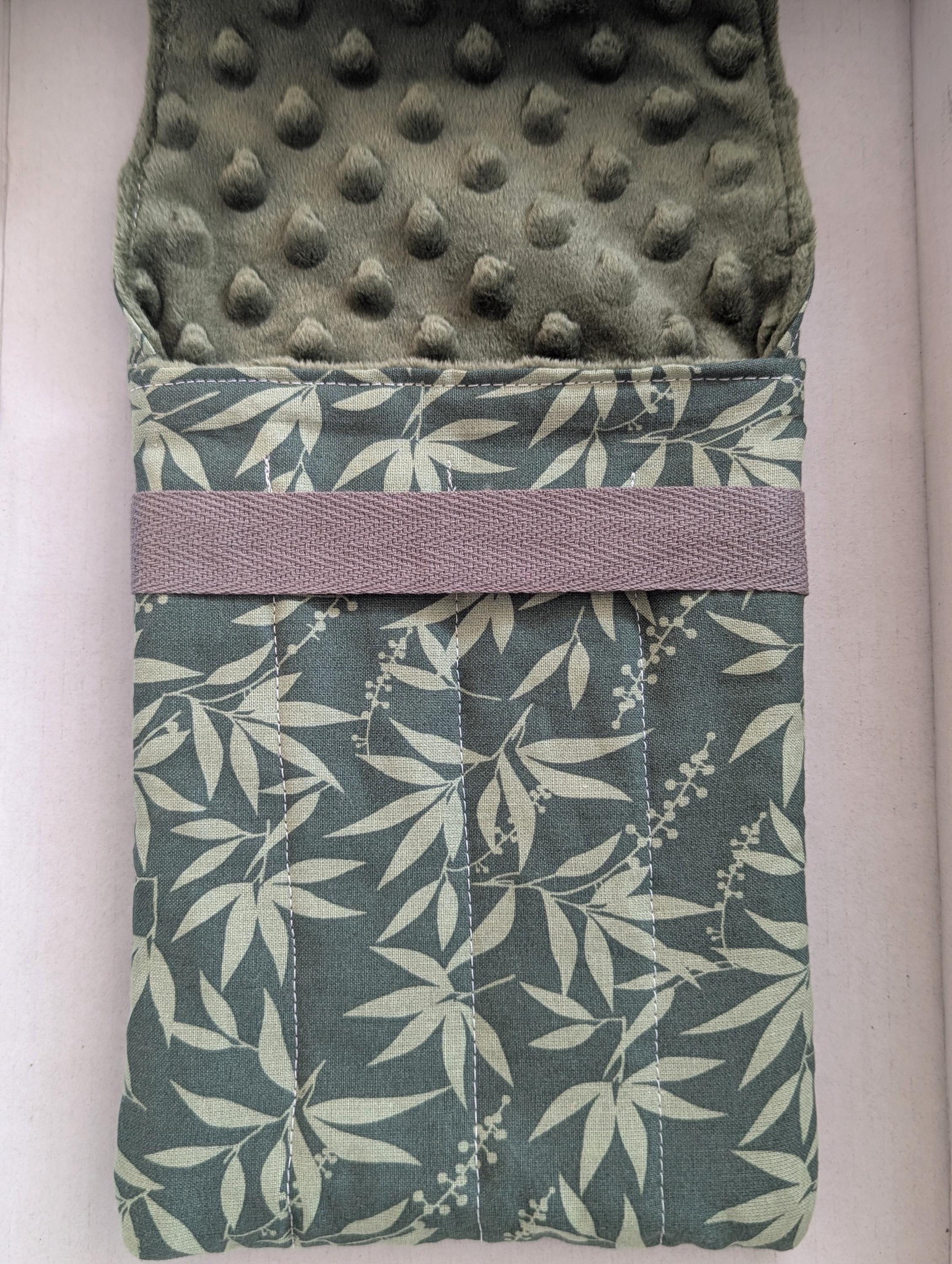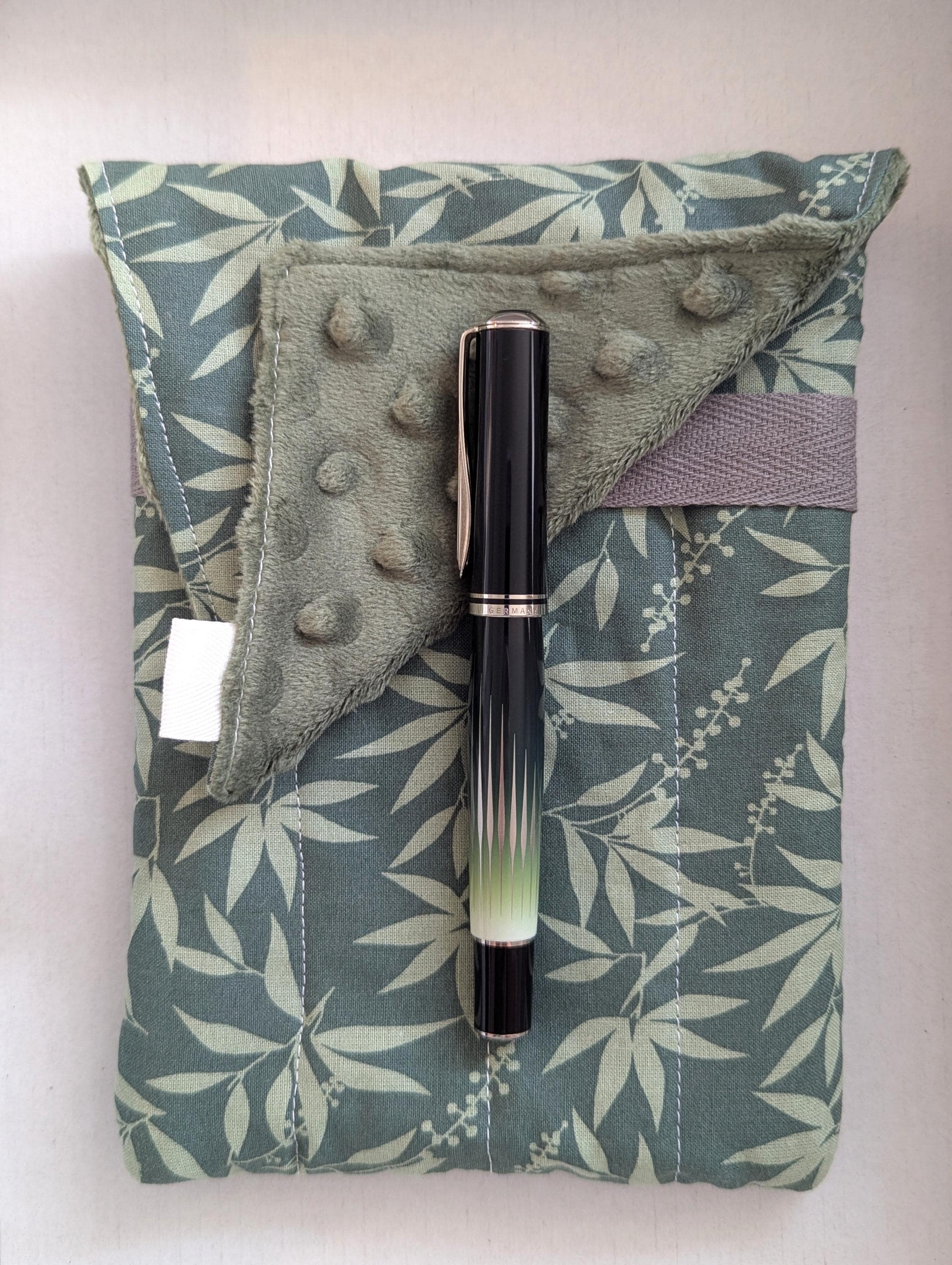 A handmade fabric fountain pen pouch that will hold 8 pens and your notebook, too! This original design holds eight pens in pockets made of soft minky fabric that will protect them from bumping into each other and keep them from being scratched. The pocket is long enough to hold big pens and it even has a center pocket where you can stash a small notebook and your phone!